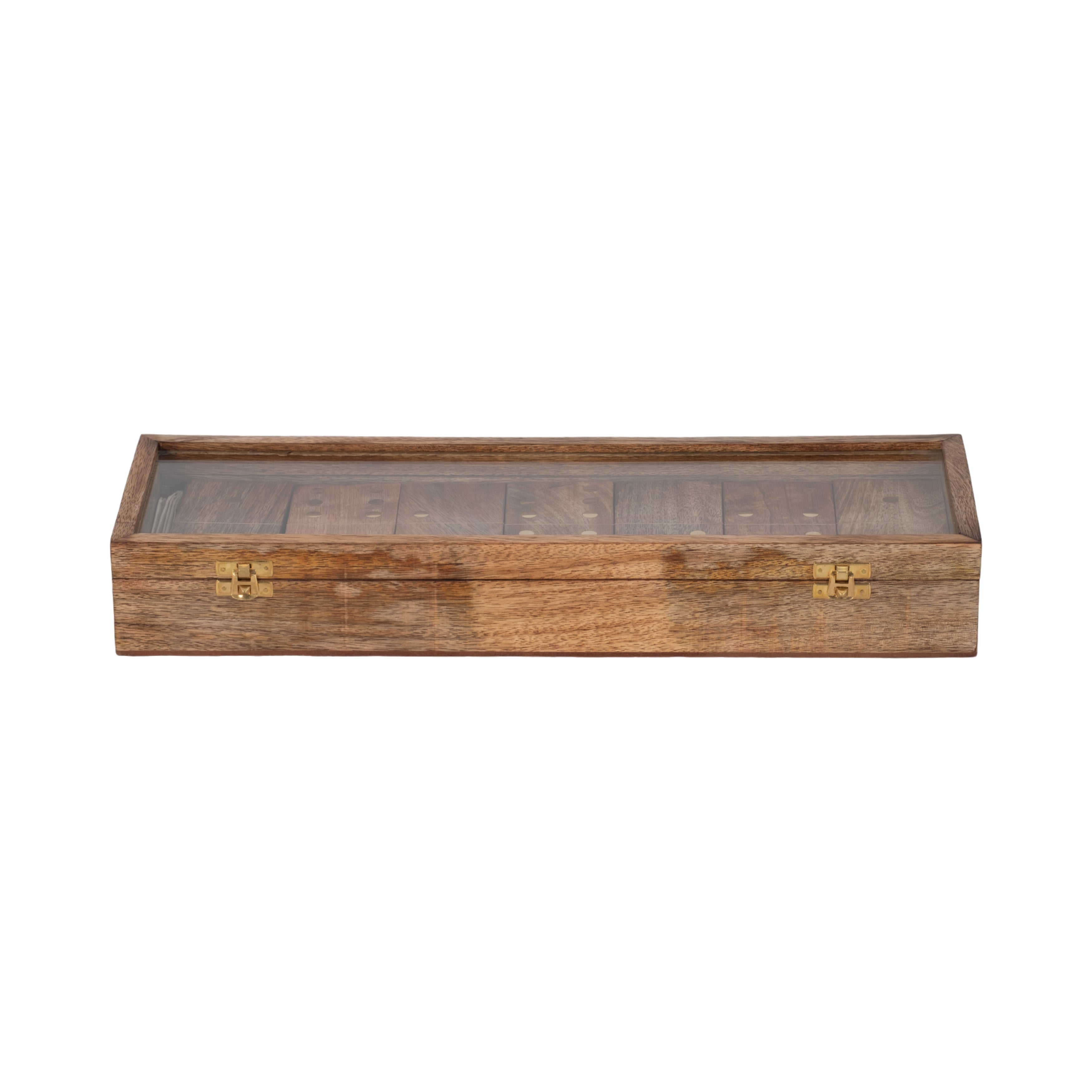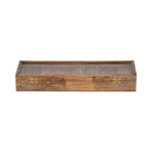 Organiza y exhibe tus objetos valiosos con este cofre rectangular de madera marrón cálido y tapa de vidrio transparente. Diseñado para guardar pequeños recuerdos y joyas, combina funcionalidad con un toque natural y elegante que aportará calidez a tu espacio.