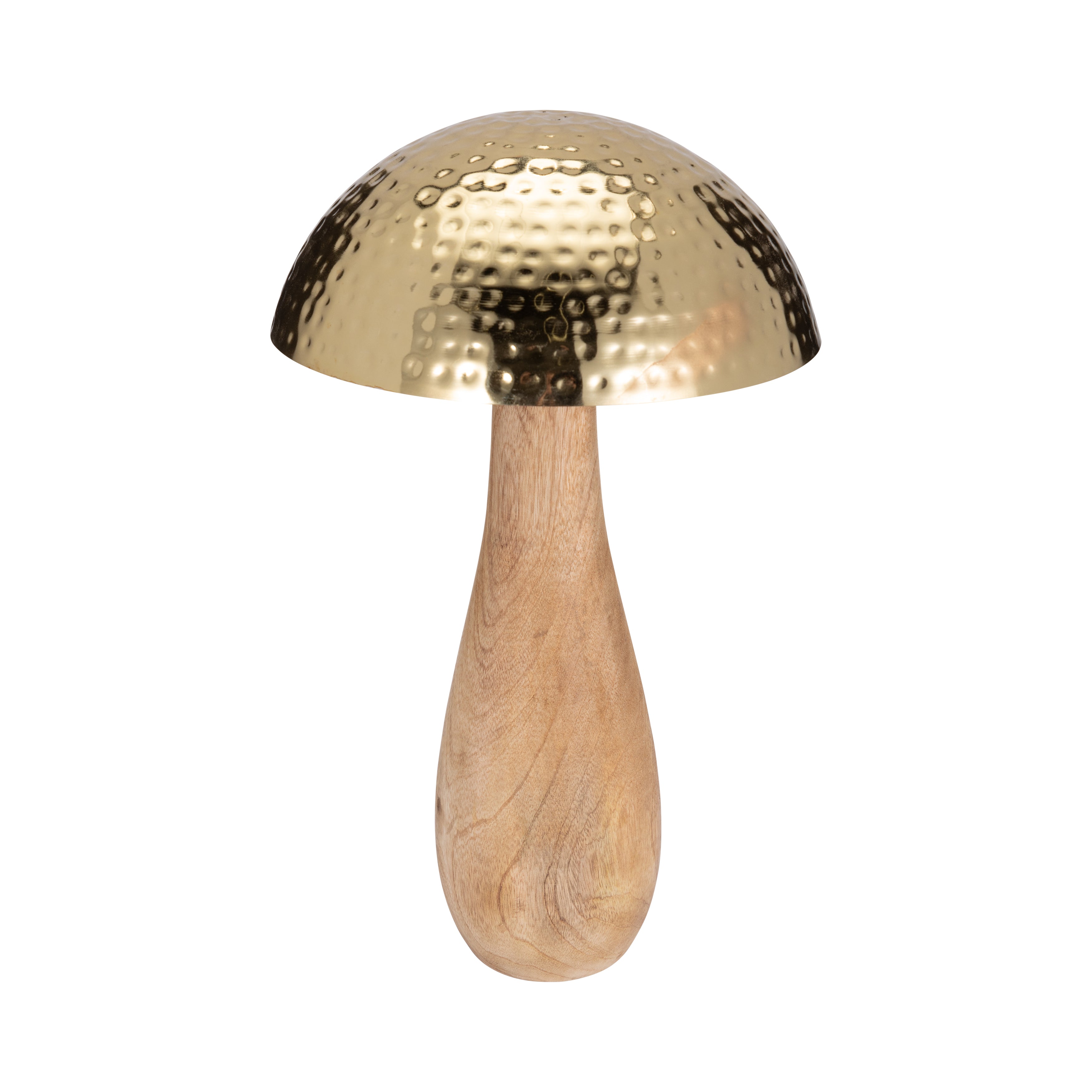 Aporta un toque de elegancia natural a tus espacios con este hongo decorativo de tamaño mediano. Combina un sombrero de metal dorado con acabado abollonado y brillante, junto con un tallo de madera cálido y suave, para crear un contraste visual atractivo y contemporáneo.