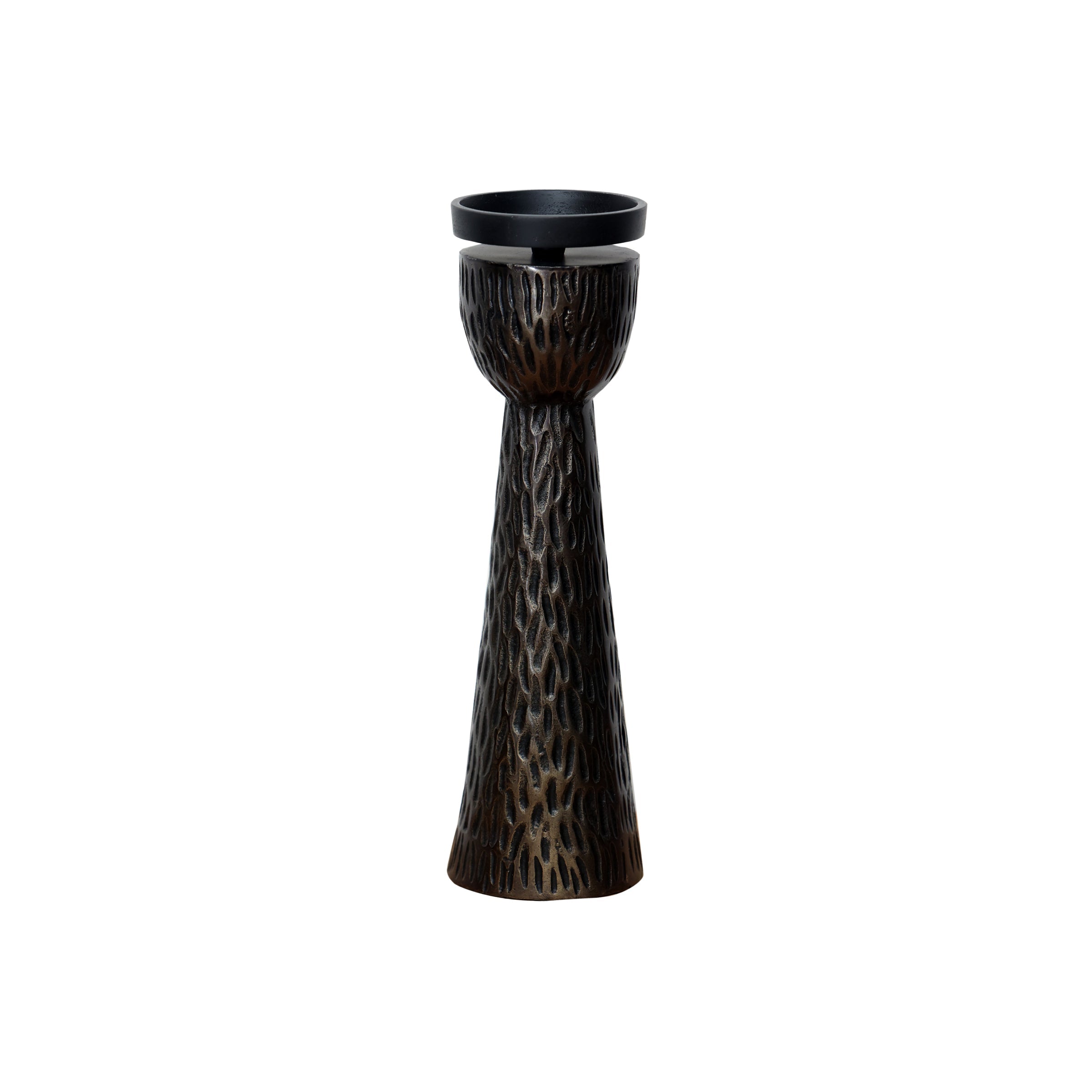 Crea un ambiente cálido y sofisticado con este candelabro mediano en tonos metálicos oscuros que combina el bronce y el negro. Su diseño con forma cónica invertida y base estable es perfecto para iluminar y decorar cualquier espacio en tu hogar o eventos especiales.