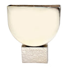 Añade un toque de sofisticación y elegancia a tu espacio con este jarrón decorativo en tonos dorados y plateados. Su diseño único combina una parte superior semicircular pulida y brillante con una base cuadrada y texturizada que aporta un contraste visual atractivo.