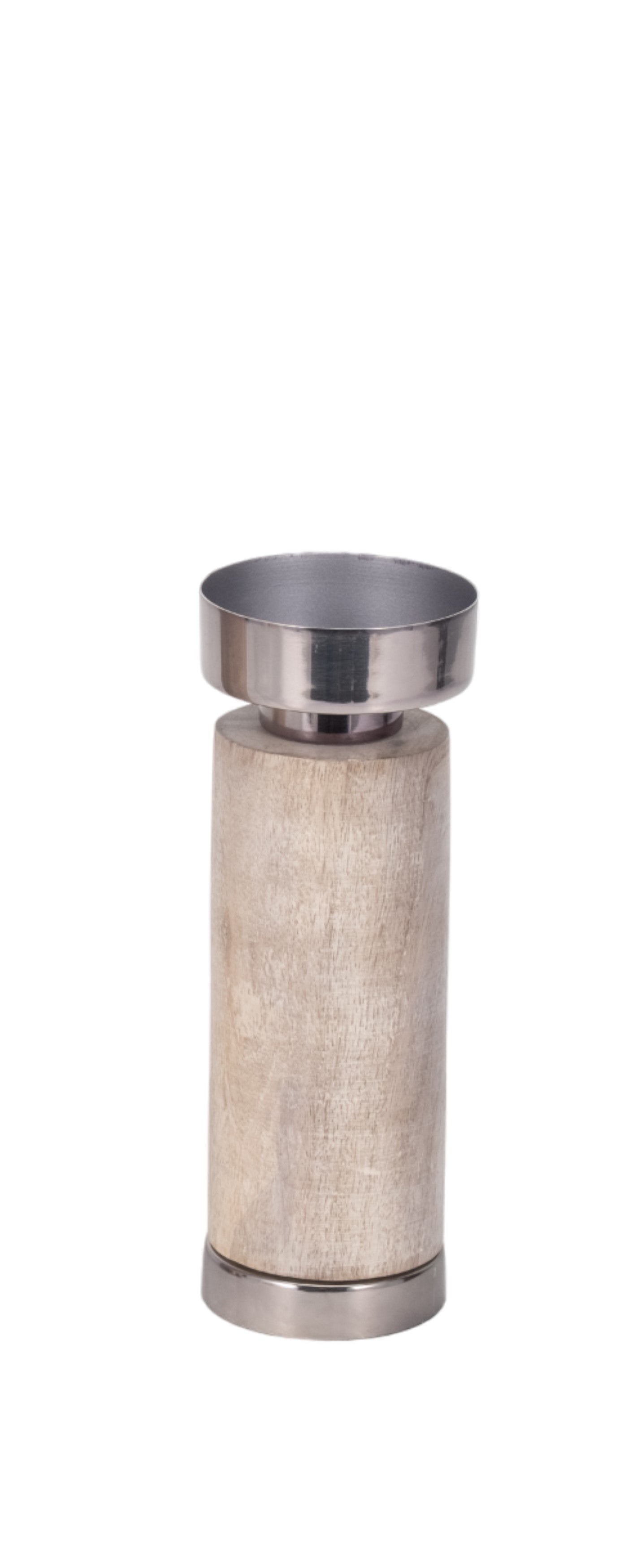 Disfruta de su estructura cilíndrica y simétrica que ofrece estabilidad total, gracias a su base metálica plateada brillante. El contraste entre la madera clara y el metal resalta en cualquier decoración, mientras que el recipiente superior asegura que tu vela se mantenga segura y en su lugar.