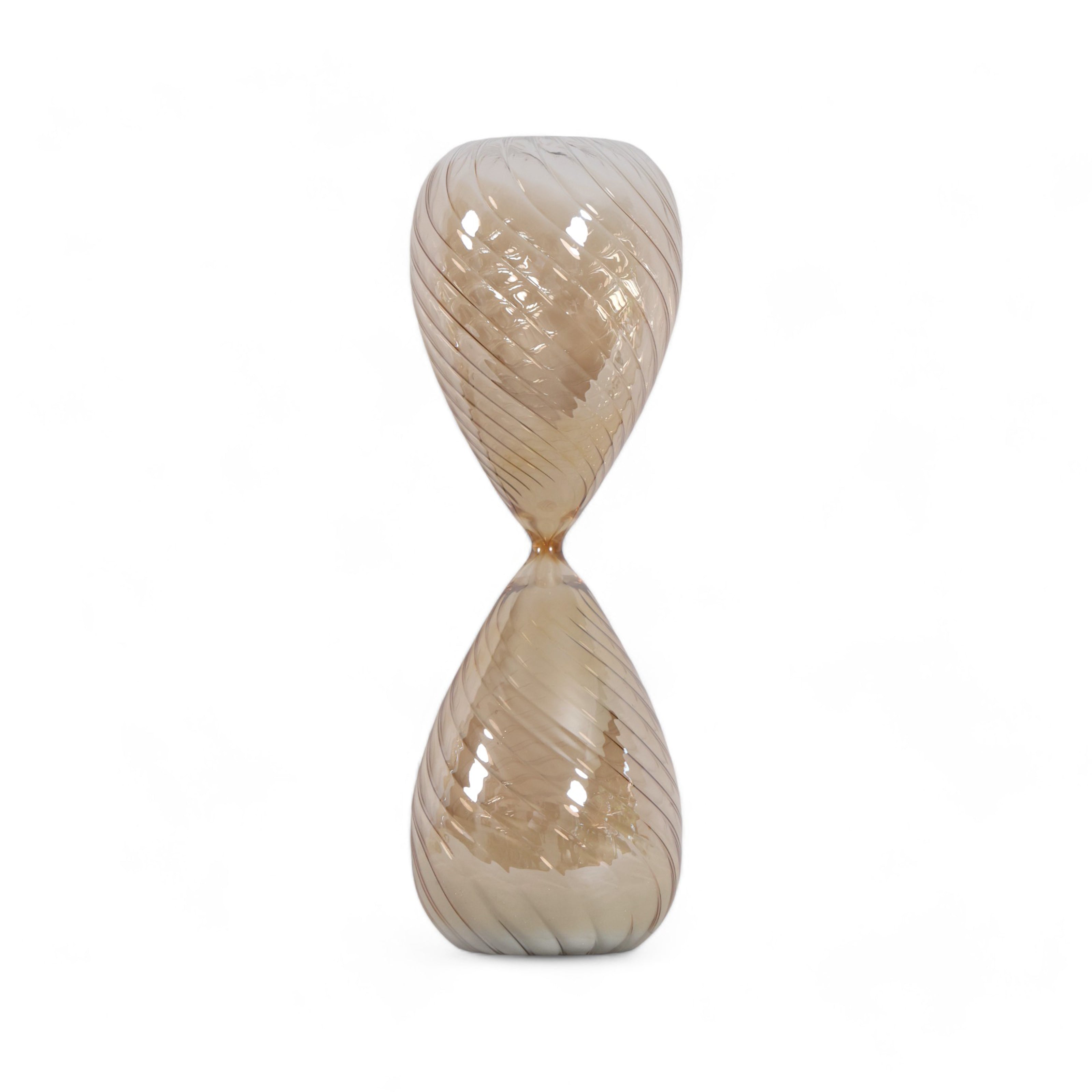Añade un toque de elegancia y funcionalidad con este reloj de arena decorativo de vidrio. Su diseño fluido y sinuoso, junto con el tono marrón claro que varía entre beige y dorado según la luz, crea un ambiente acogedor y sofisticado en cualquier espacio.