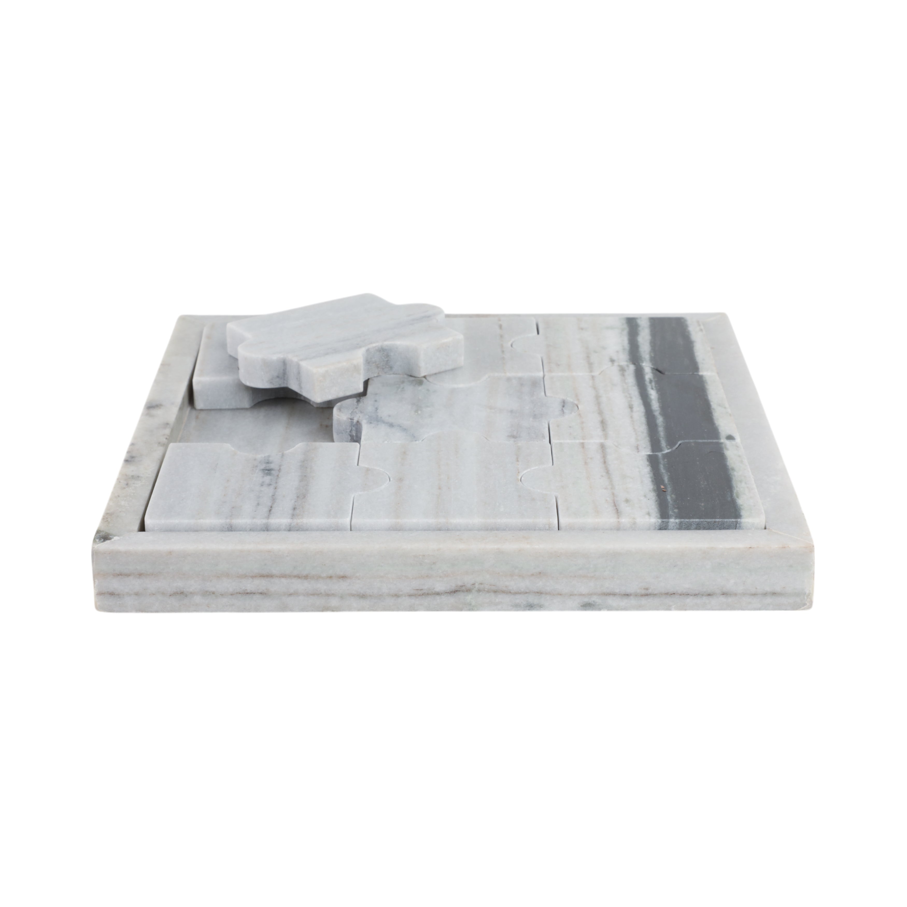 Con un diseño rectangular y piezas modulares que encajan fácilmente, este juego presenta tonos grises y blancos con vetas sutiles, brindando una apariencia elegante y contemporánea. Su tamaño compacto permite ubicarlo en mesas o superficies decorativas para un impacto visual sutil pero atractivo.