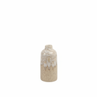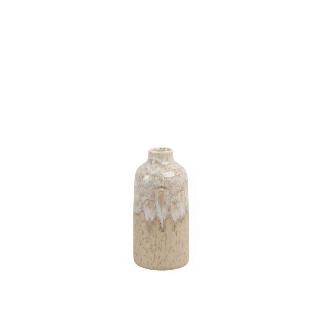 Con un acabado brillante en tonos beige y blanco que se difuminan suavemente, esta botella ofrece un toque de sofisticación y arte en cada detalle, destacando su textura única y su forma cilíndrica con cuello acentuado.