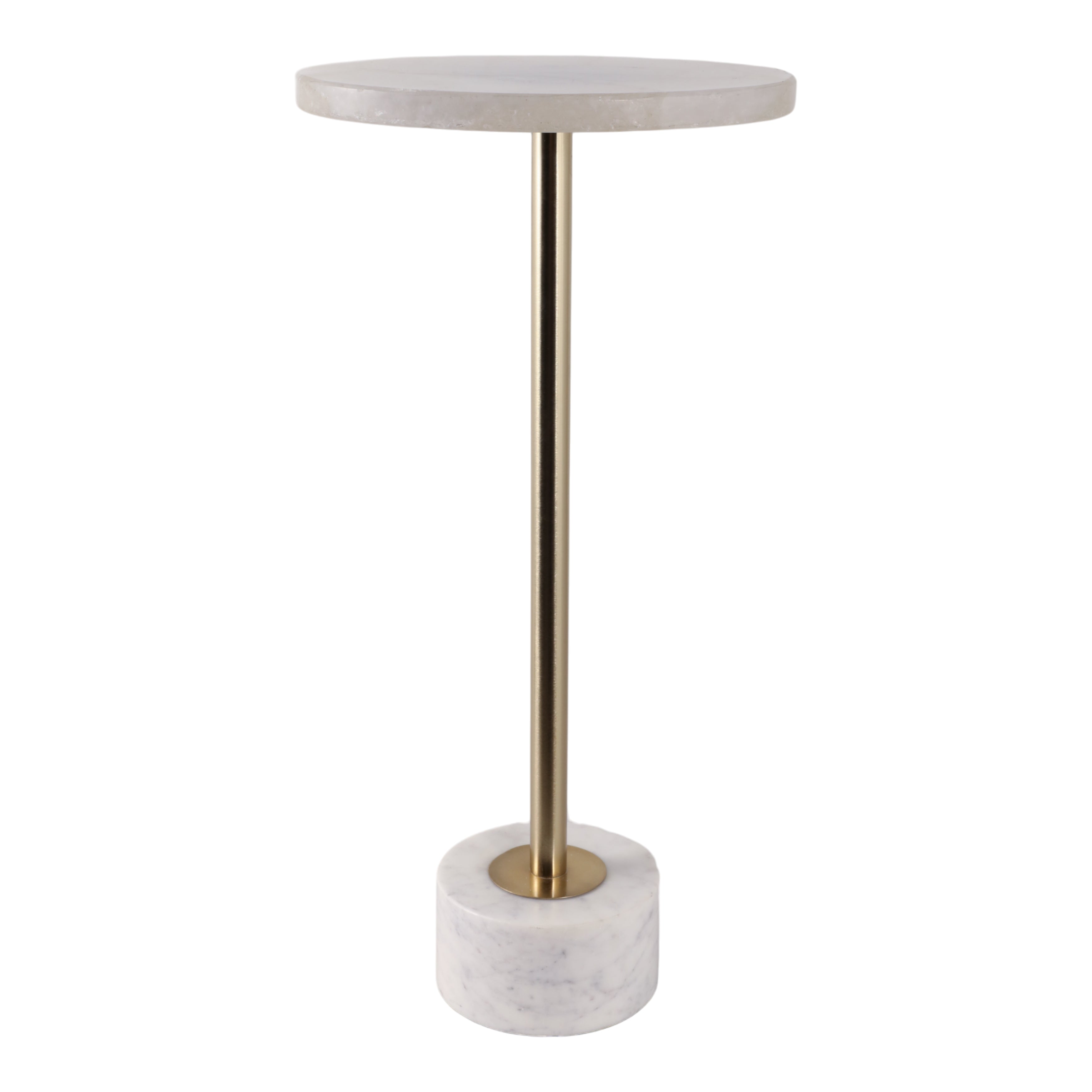 Perfecta para colocar bebidas, libros u objetos decorativos al alcance mientras disfrutas de tu sala o salón. Su base cilíndrica de mármol asegura estabilidad, mientras que el soporte central metálico en tono dorado aporta un contraste sutil y sofisticado.