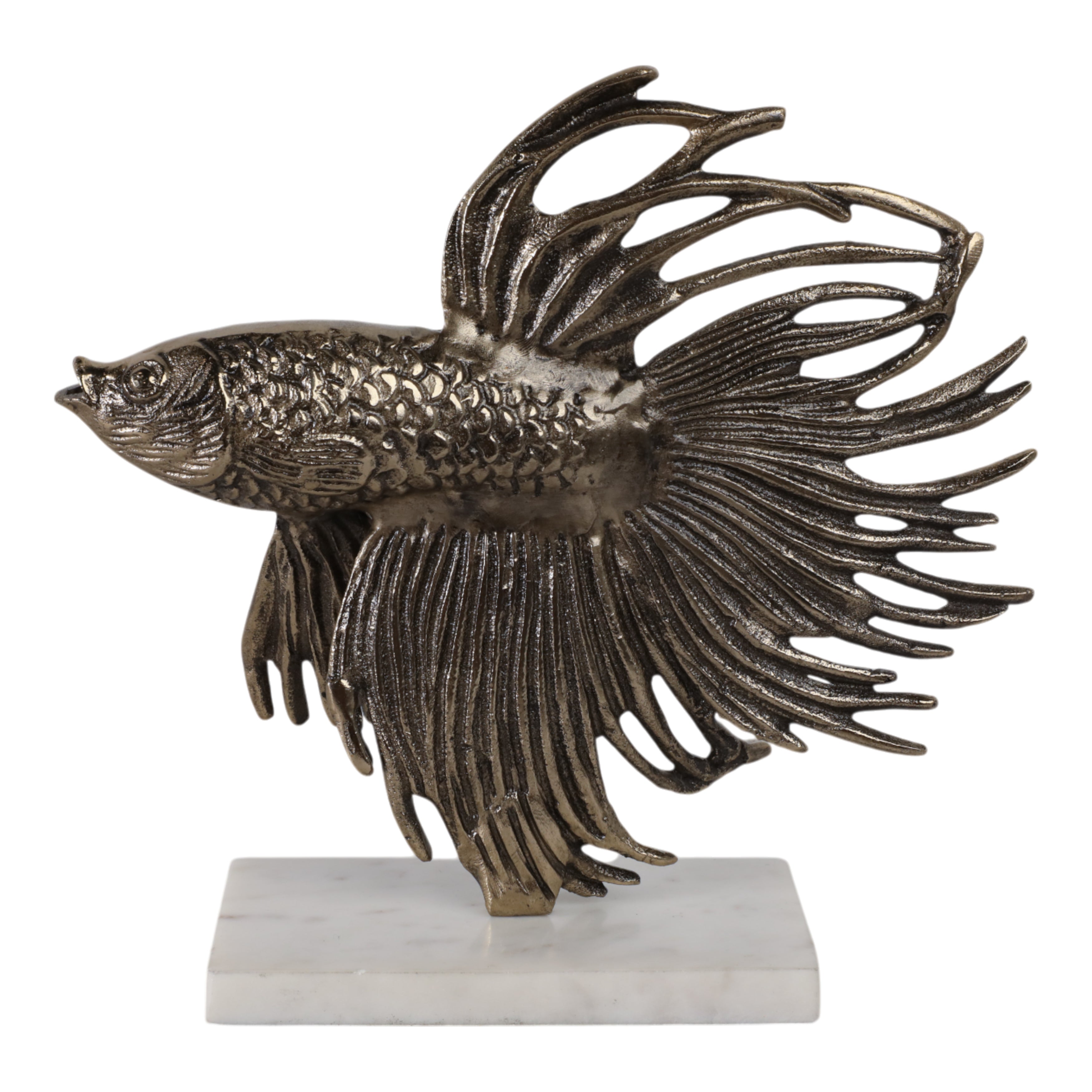 Agrega un toque de elegancia y movimiento a tus espacios con esta escultura de pez en tonos metálicos bronce envejecido. Su diseño dinámico y fluido captura la belleza natural, convirtiéndola en un adorno perfecto para salas, oficinas o estanterías.
