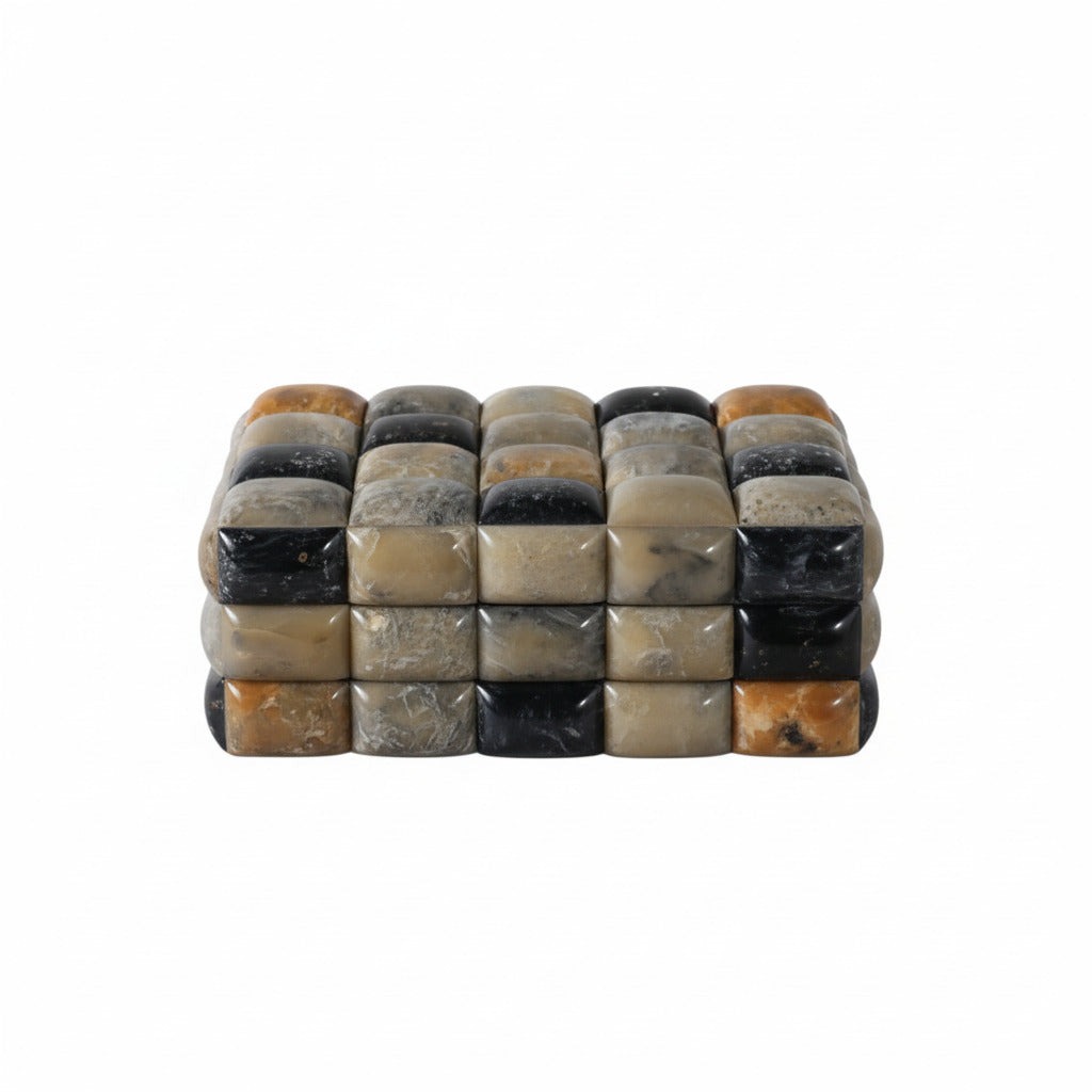 Su patrón geométrico en bloques y su paleta de marrones, grises, negros y ocres evocan la elegancia de las piedras naturales, mientras que su superficie lisa y brillante añade un acabado pulido y sofisticado. La tapa facilita el acceso interior, ideal para mantener tus artículos organizados sin complicaciones.