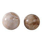 Cada bola tiene una superficie lisa y pulida que resalta las vetas y patrones únicos de la madera, ofreciendo un acabado brillante que capta la luz y la atención. El set incluye dos bolas de diferente tamaño, 15 cm y 10 cm de diámetro, para crear un balance visual armonioso y atractivo en tu decoración.