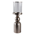 Añade un toque de elegancia y ambiente a tus espacios con este candelabro metálico en tonos grisáceos y plateados. Su diseño vertical combina una base robusta y cilíndrica con una plaqueta circular para sostener la vela, mientras que el cilindro de vidrio transparente protege la llama de corrientes, ideal para uso interior y exterior.