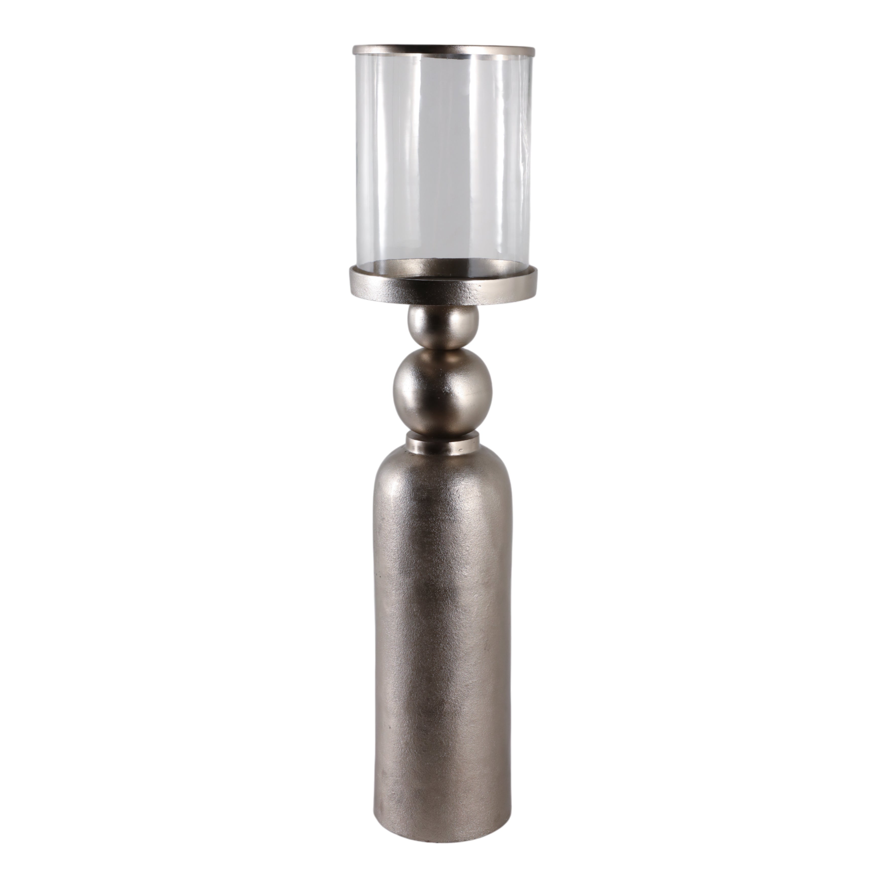 Añade un toque de calidez y elegancia a tus espacios con este candelabro metálico plateado. Su diseño vertical y sofisticado combina una base cilíndrica que se ensancha suavemente con una distintiva esfera metálica, creando un elemento decorativo sublime para cualquier ambiente interior.