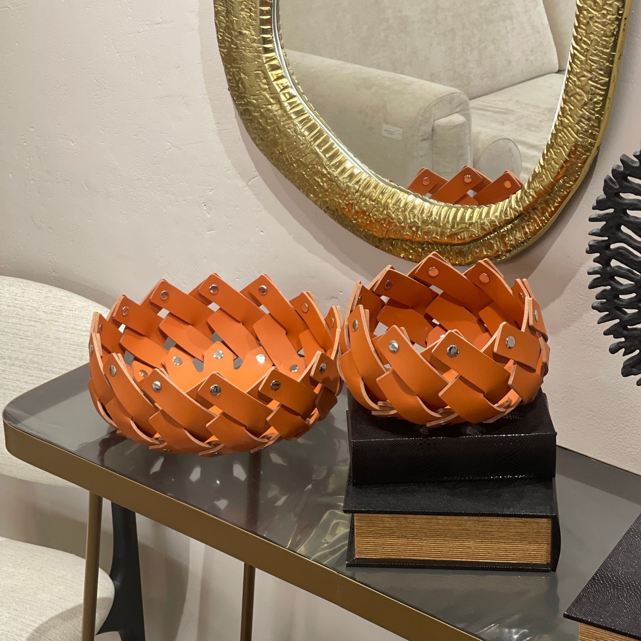 Agrega un toque de energía y estilo artesanal a tu hogar con esta canasta tejida de cuero naranja mediana. Perfecta para organizar tus pequeños objetos o decorar tus estantes y mesas, combina funcionalidad y diseño en una sola pieza.