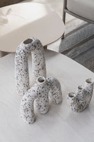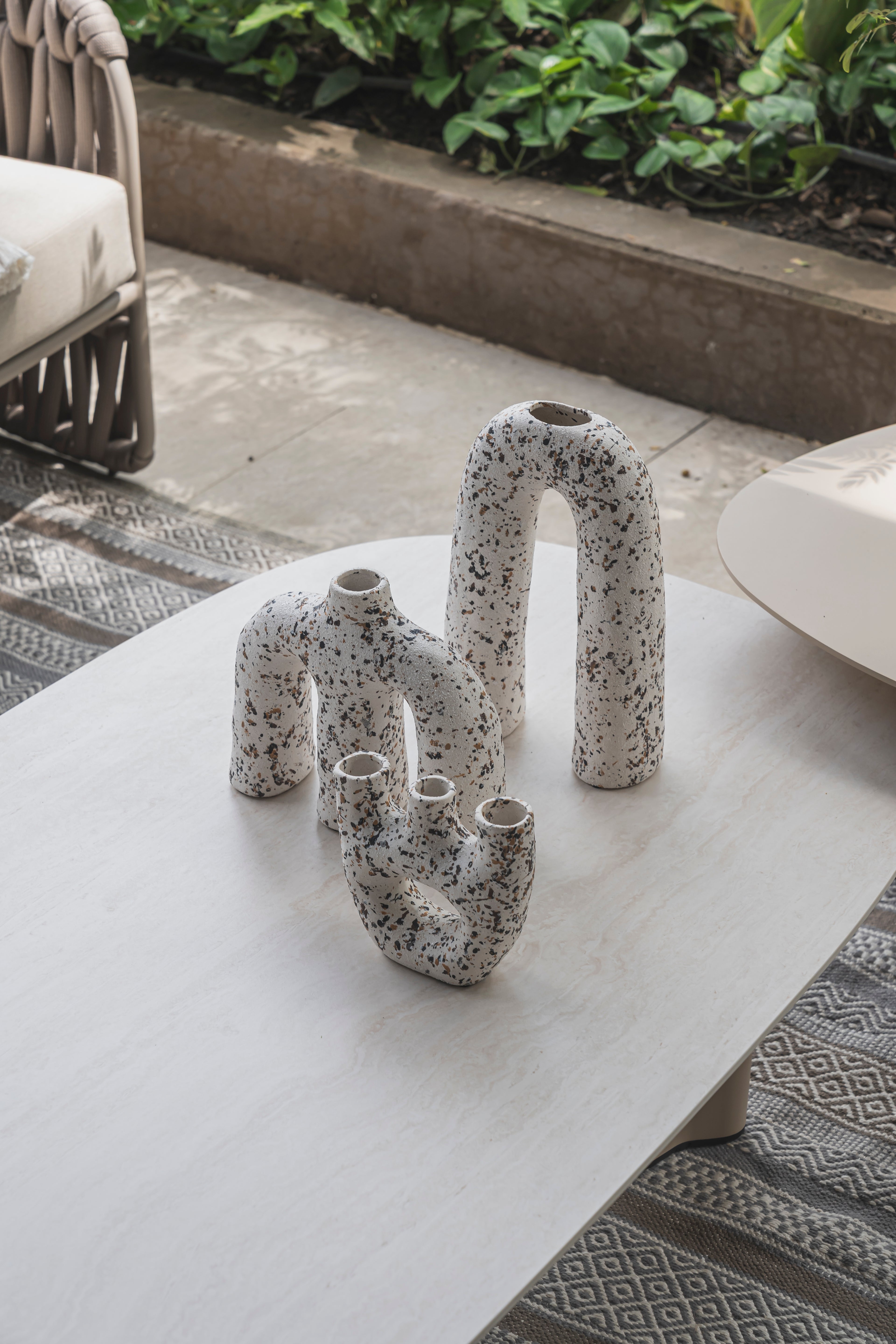 Agrega un toque artístico y natural a tus espacios con este jarrón decorativo de cerámica en un delicado blanco cremoso con detalles marrones y grisáceos. Su diseño irregular y abstracto, inspirado en figuras geométricas, no solo funciona para contener flores sino que también es un elemento ornamental que enriquecerá cualquier ambiente interior.