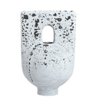 La textura suave y mate, junto con su acabado artesanal en blanco con manchas y salpicaduras en tonos gris oscuro y negro, aporta un carácter único y contemporáneo. De tamaño mediano, se integra fácilmente en distintos ambientes sin sobrecargarlos.