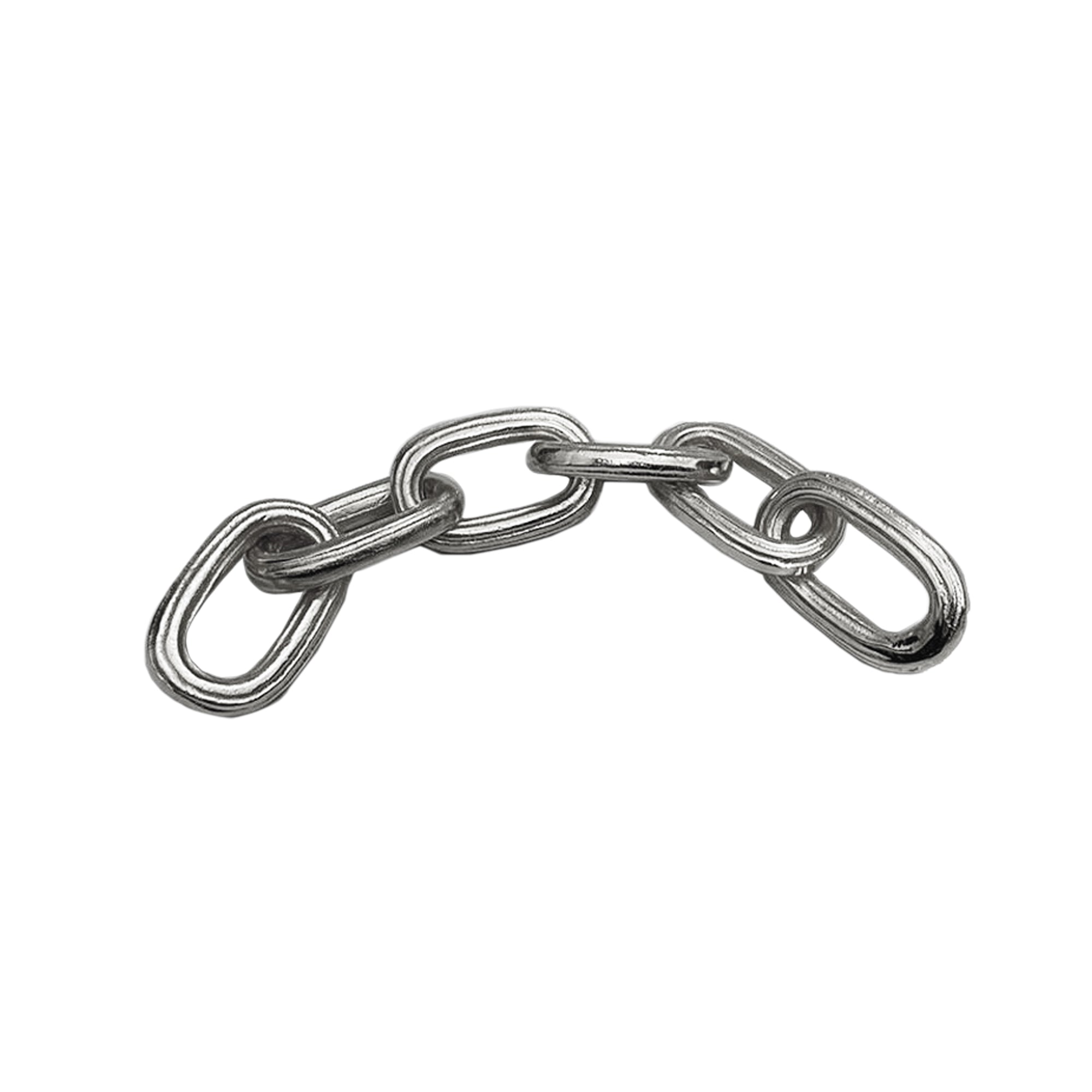 Su diseño alargado con eslabones ovalados y rectangulares entrelazados ofrece un acabado metálico pulido que refleja la luz, realzando tus creaciones con un brillo sutil y elegante.
