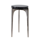 Mesa auxiliar pequeña con base metálica plateada y tablero de piedra negra