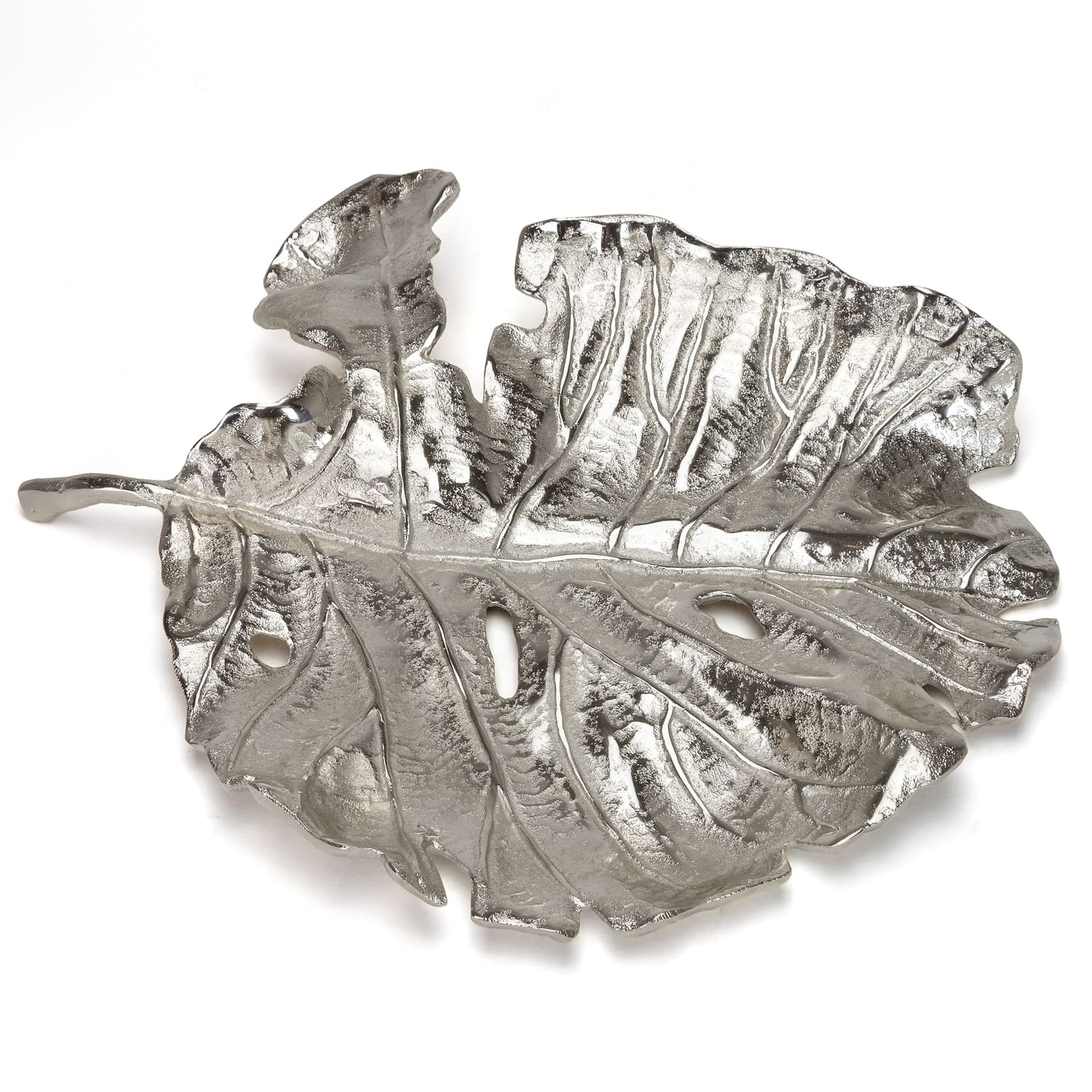 Agrega un toque de elegancia natural a tus espacios con nuestra bandeja decorativa en forma de hoja tropical. Su diseño orgánico y detalles en metal plateado brillante crean un ambiente sofisticado y moderno que realza cualquier mesa o repisa.