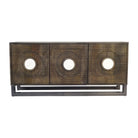 Fabricada en madera con un acabado texturizado marrón oscuro que resalta sus vetas naturales, cuenta con tres cajones deslizantes que ofrecen amplio espacio de almacenamiento. Los botones blancos de cerámica aportan un contraste luminoso y un detalle sofisticado, mientras que su base metálica asegura durabilidad y estabilidad.