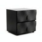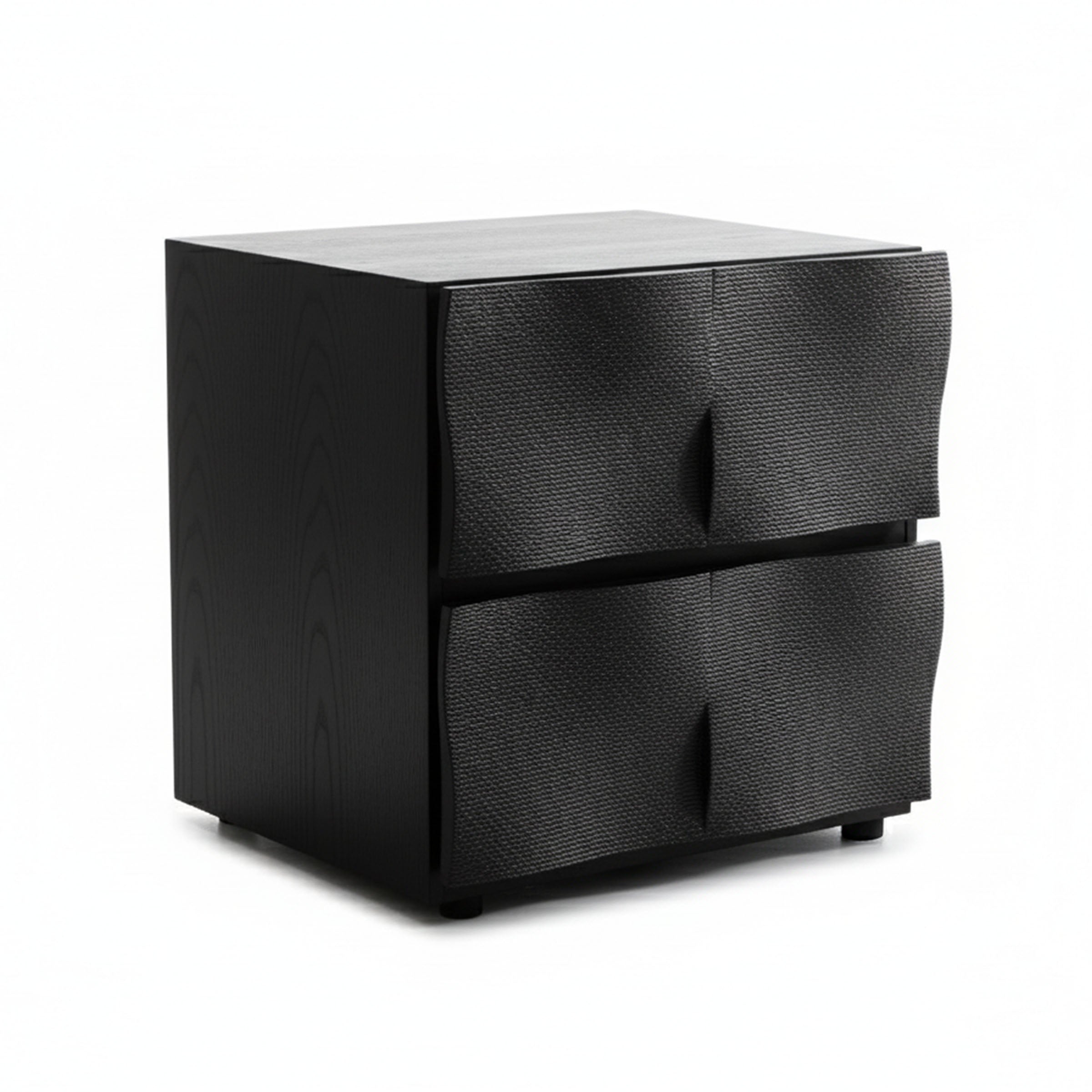Este mueble de almacenamiento presenta una estructura rectangular con líneas rectas y dos cajones frontales curvados y texturizados, los cuales ofrecen una apertura fácil sin tiradores, haciendo de su uso una experiencia cómoda y práctica.