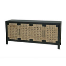 Su diseño rectangular y bajo, con estructura sólida en color negro mate, se eleva sobre cuatro patas que aportan estabilidad y un toque de ligereza visual. La textura natural del mimbre en tonos beige y marrón claro crea un agradable contraste que realza su diseño.