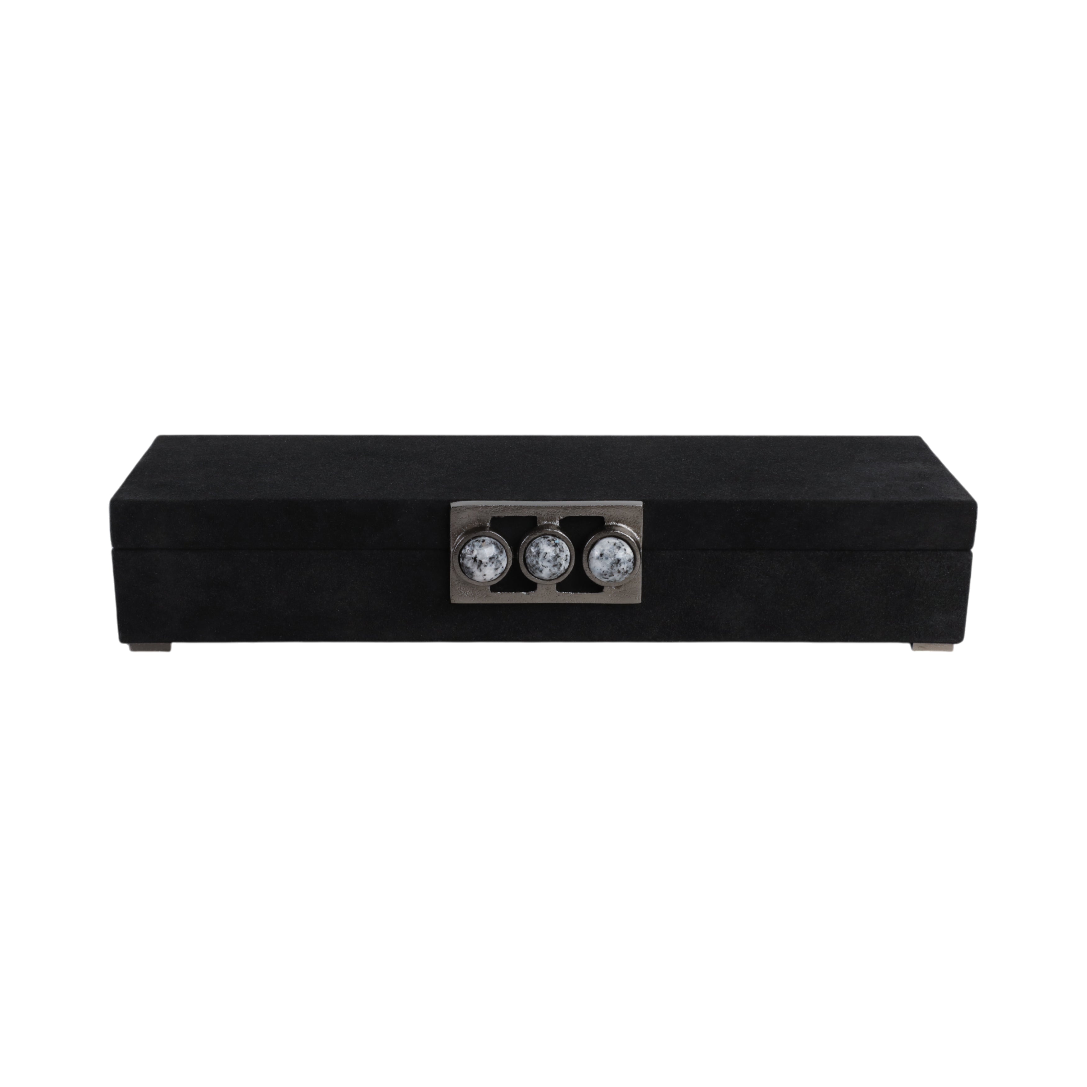 Organiza tus objetos personales con estilo y seguridad. Este cofre rectangular en color negro profundo ofrece un diseño contemporáneo y elegante que se adapta perfectamente a cualquier espacio, como escritorios o mesas. Su acabado mate aporta sofisticación y discreción a tu entorno.