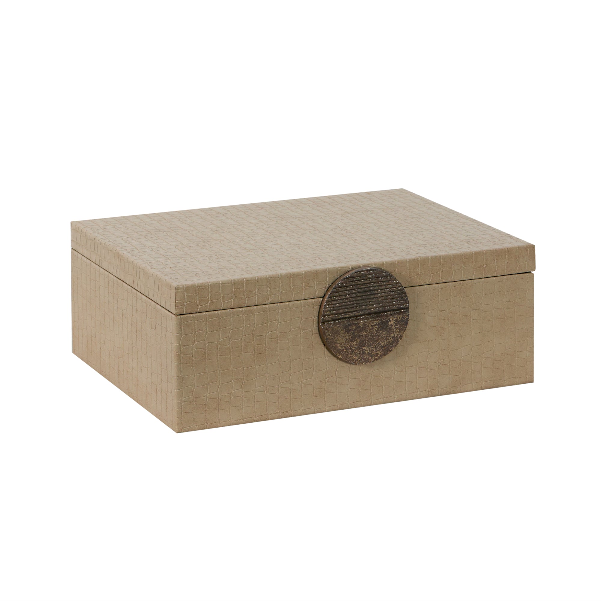 Diseñado con una estructura rectangular y tapa plana, este cofre es ideal para almacenar diversos objetos mientras sirve como un mueble decorativo versátil. El cierre redondo metálico facilita su uso y añade un detalle sofisticado a su apariencia.