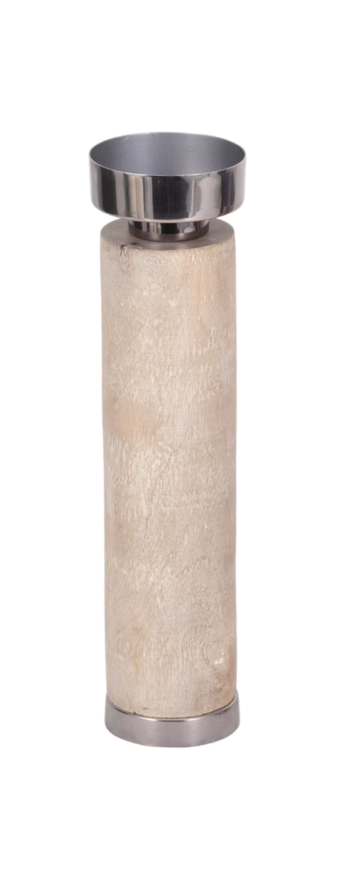 Ilumina tu espacio con estilo y calidez gracias a este candelabro grande diseñado para sostener una vela con seguridad y elegancia. Su combinación de madera natural clara y detalles metálicos plateados crea un ambiente acogedor y decorativo que transforma cualquier mesa o estante en un punto focal atractivo.
