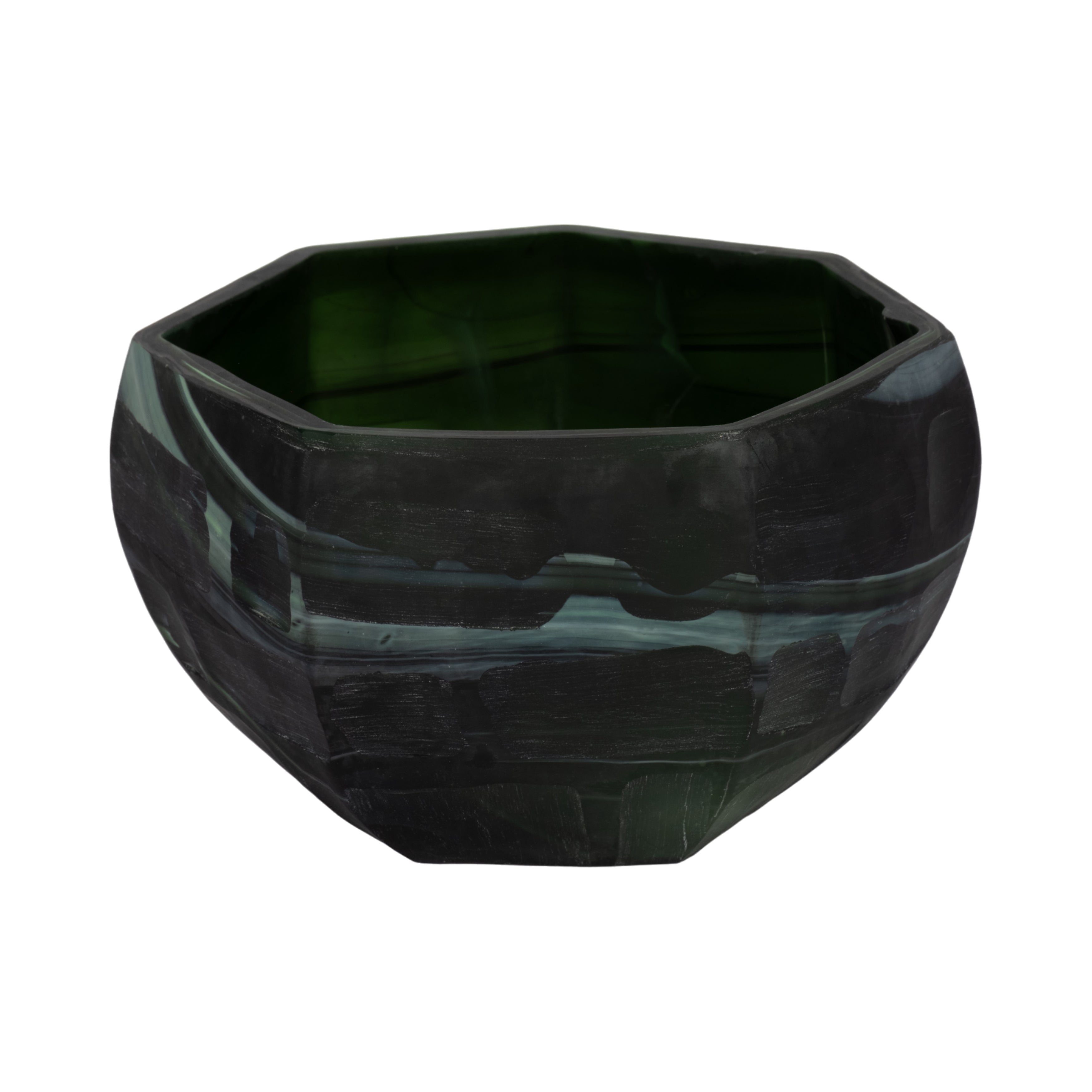 Da un toque de modernidad a tu espacio con este tazón decorativo de forma octogonal que combina tonos verdes, negros y vetas azul claro para un contraste visual impactante. Perfecto para quienes buscan una pieza elegante y funcional que resalte en cualquier mesa o estante.