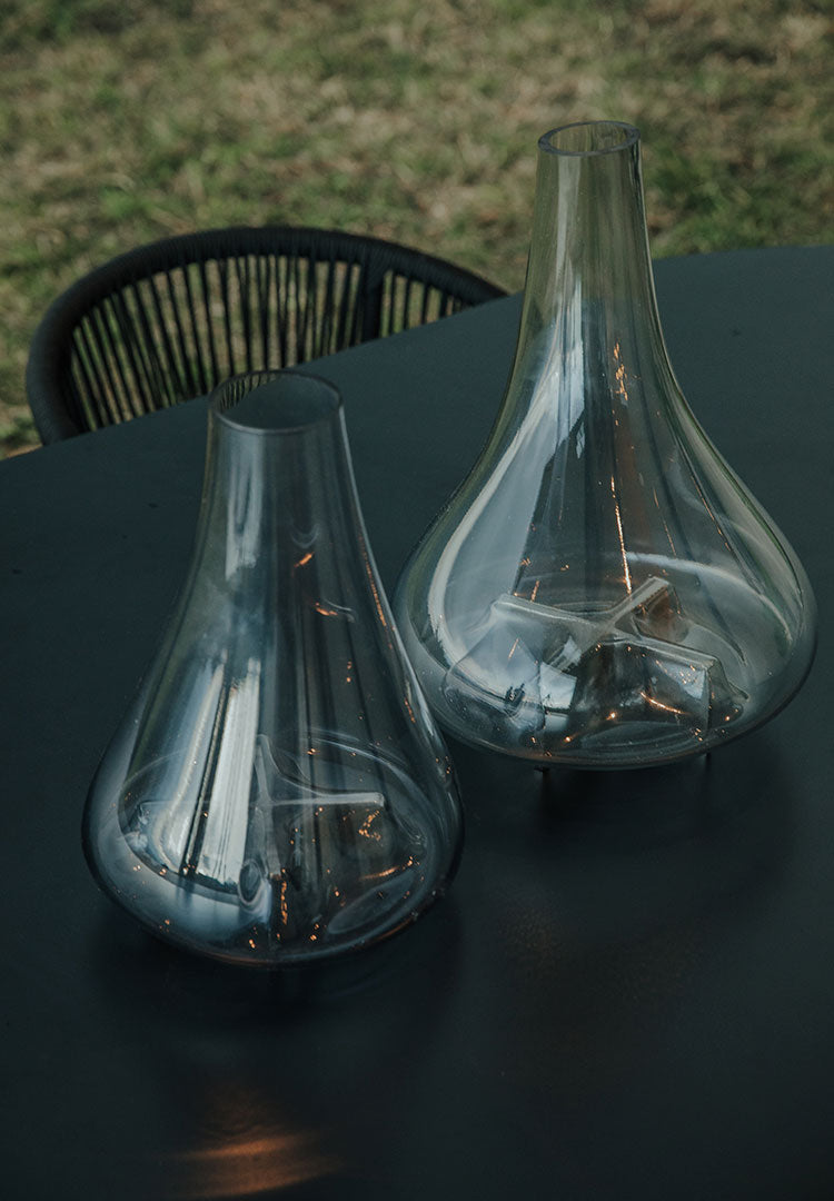 Fabricado en vidrio gris translúcido con una base metálica plateada, combina texturas y colores que reflejan la luz de forma atractiva, creando un ambiente sofisticado y luminoso en tu hogar u oficina.