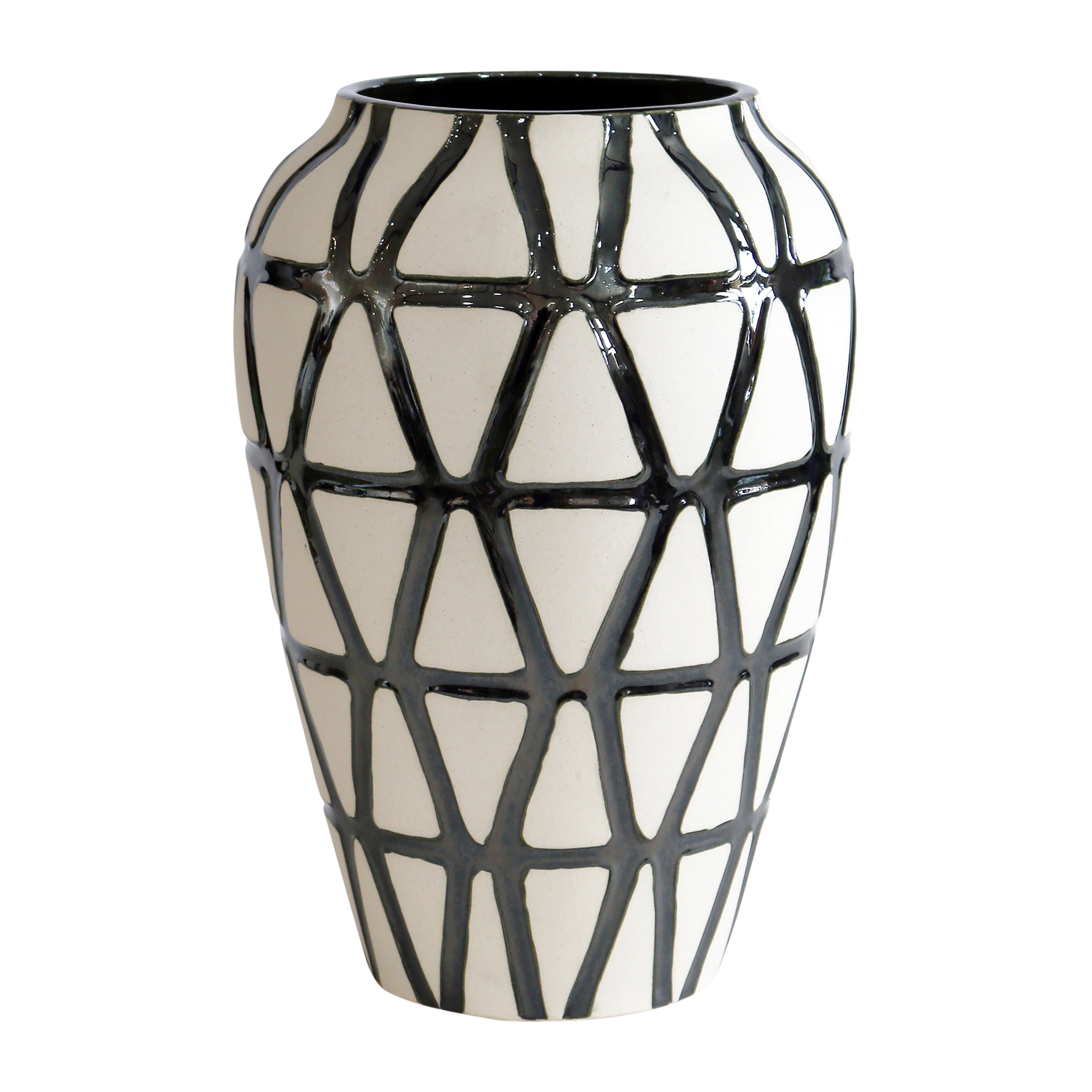 Su forma ovalada robusta, con base más ancha que se estrecha hacia arriba, crea un perfil equilibrado y atractivo. La combinación de un acabado blanco brillante con patrones geométricos negros añade un contraste visual que realza cualquier ambiente.