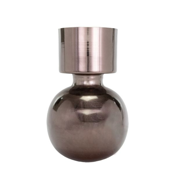 Agrega un toque de elegancia moderna a tus espacios con este jarrón esférico de aluminio en tono cobre. Su diseño estilizado combina una base redonda con un cuello cilíndrico que crea un contraste visual encantador y sofisticado.