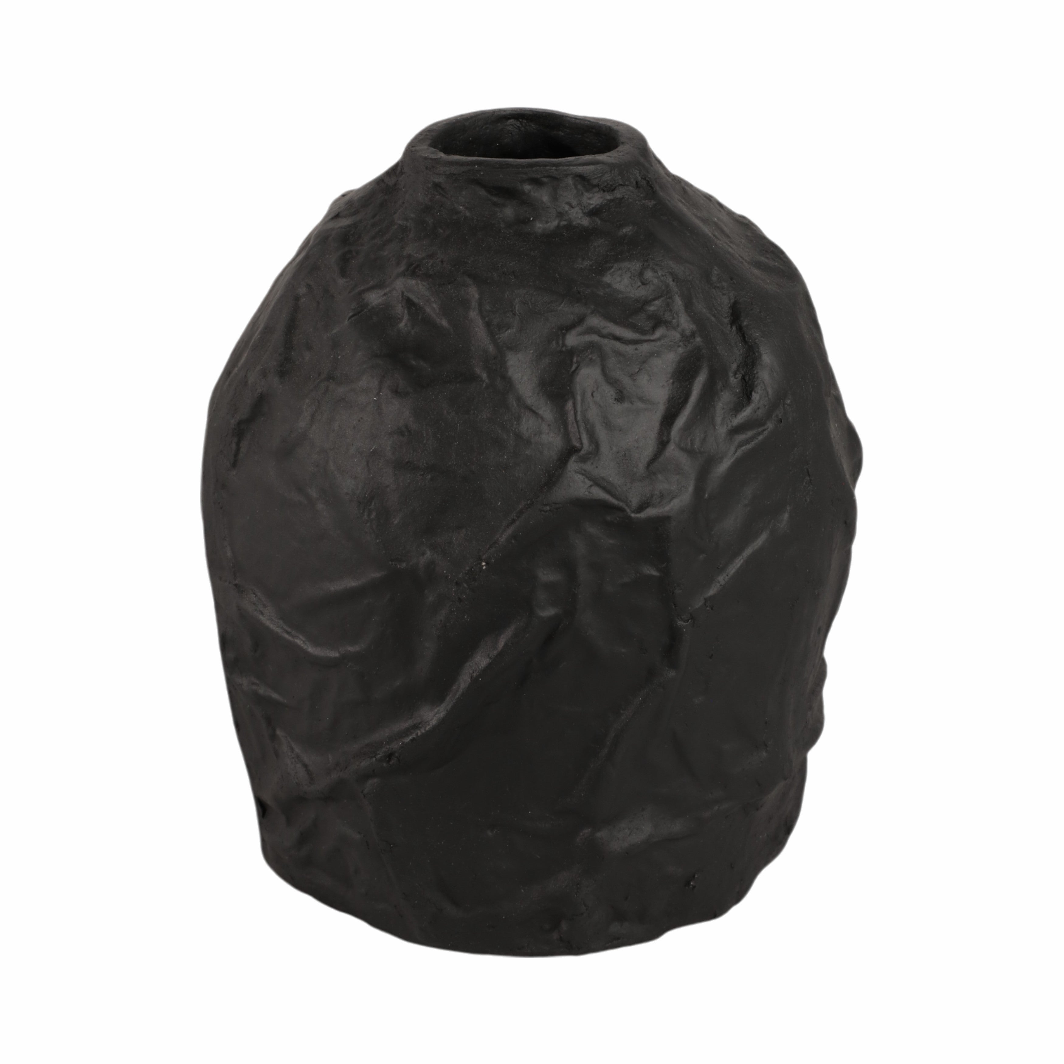 Perfecto para exhibir flores o decorar mesas y estantes, su tamaño mediano y estructura robusta aseguran estabilidad y versatilidad. El acabado mate en negro añade sofisticación minimalista y resalta las sutiles variaciones de su superficie rugosa.