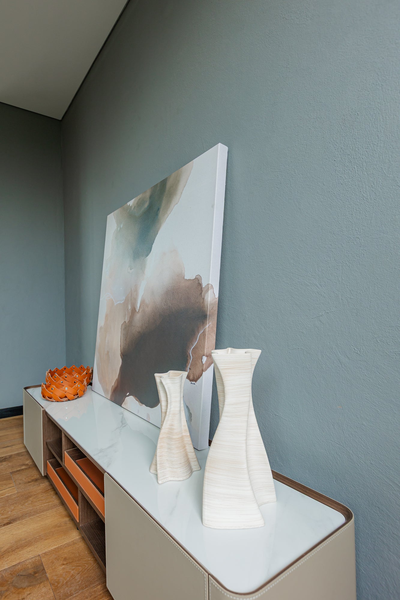 Con un acabado mate y superficie lisa, este jarrón minimalista destaca por sus sutiles vetas que añaden profundidad y textura sin sobrecargar la decoración. Perfecto para exhibir flores o como una pieza decorativa independiente, combina modernidad y dinamismo en un solo diseño.