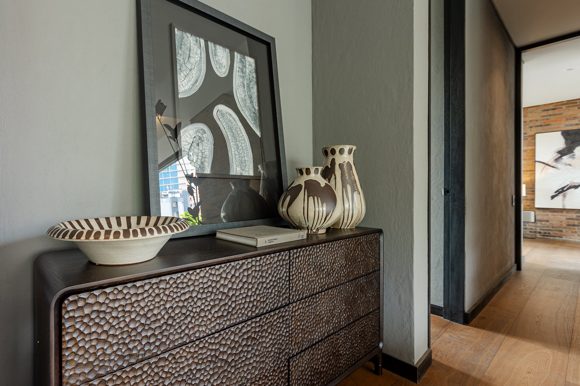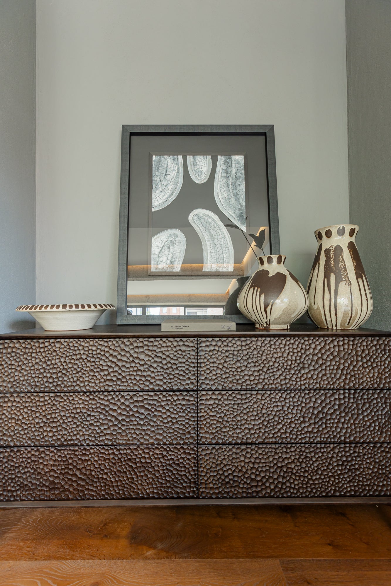 Disfruta de su acabado mate con detalles en beige claro y patrones de goteo blanco que añaden textura y dinamismo a su diseño artesanal. Es un tamaño ideal para mesas o estantes, fácil de combinar con distintos estilos de decoración.