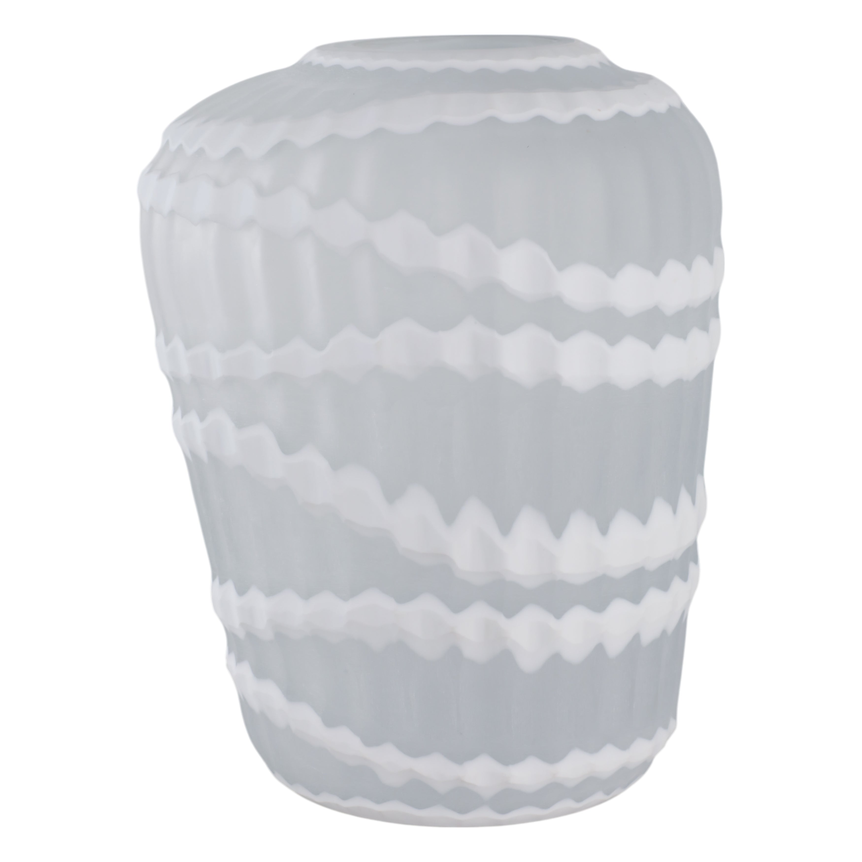 Agrega un toque de serenidad a tu espacio con este jarrón decorativo de tonos gris suave y líneas blancas onduladas. Su forma robusta y orgánica transmite estabilidad y elegancia, ideal para resaltar flores o como pieza ornamental.