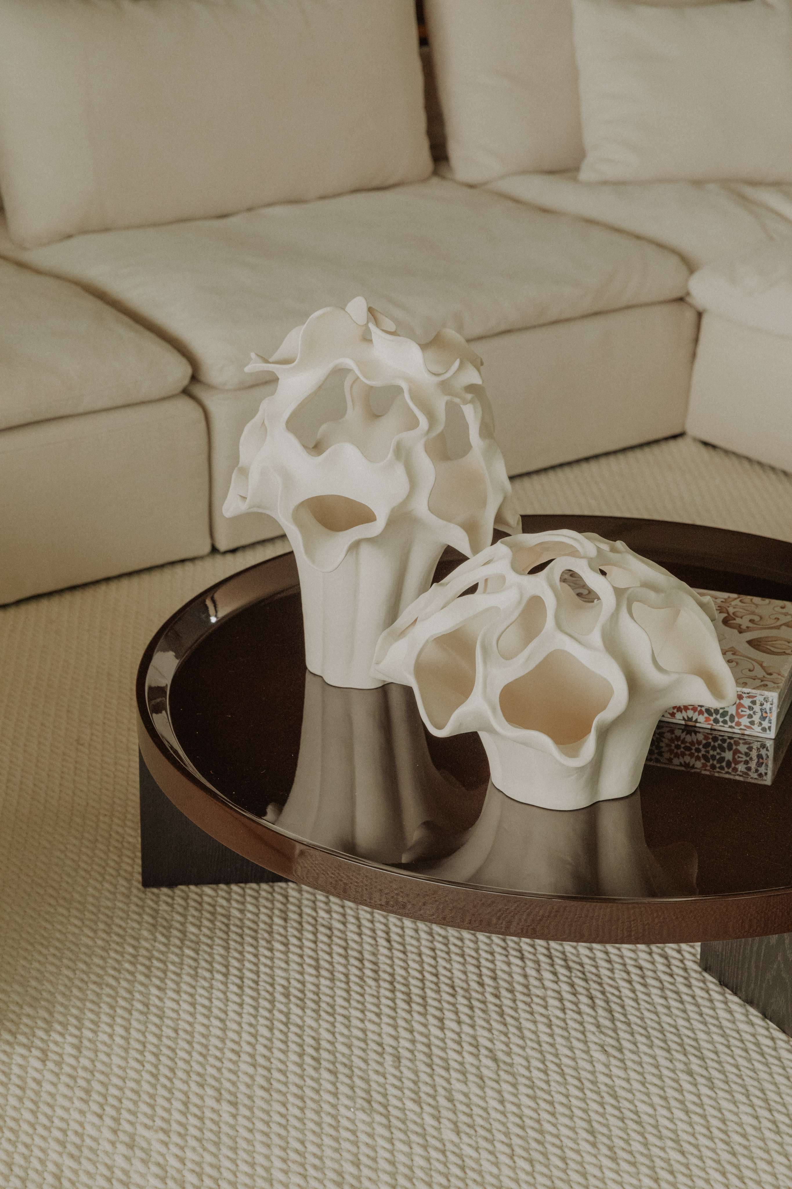 Agrega un toque de elegancia serena a tus espacios con este jarrón decorativo de porcelana. Su diseño asimétrico y orgánico, inspirado en formas naturales como flores o coral, crea un punto focal artístico que transforma cualquier ambiente.