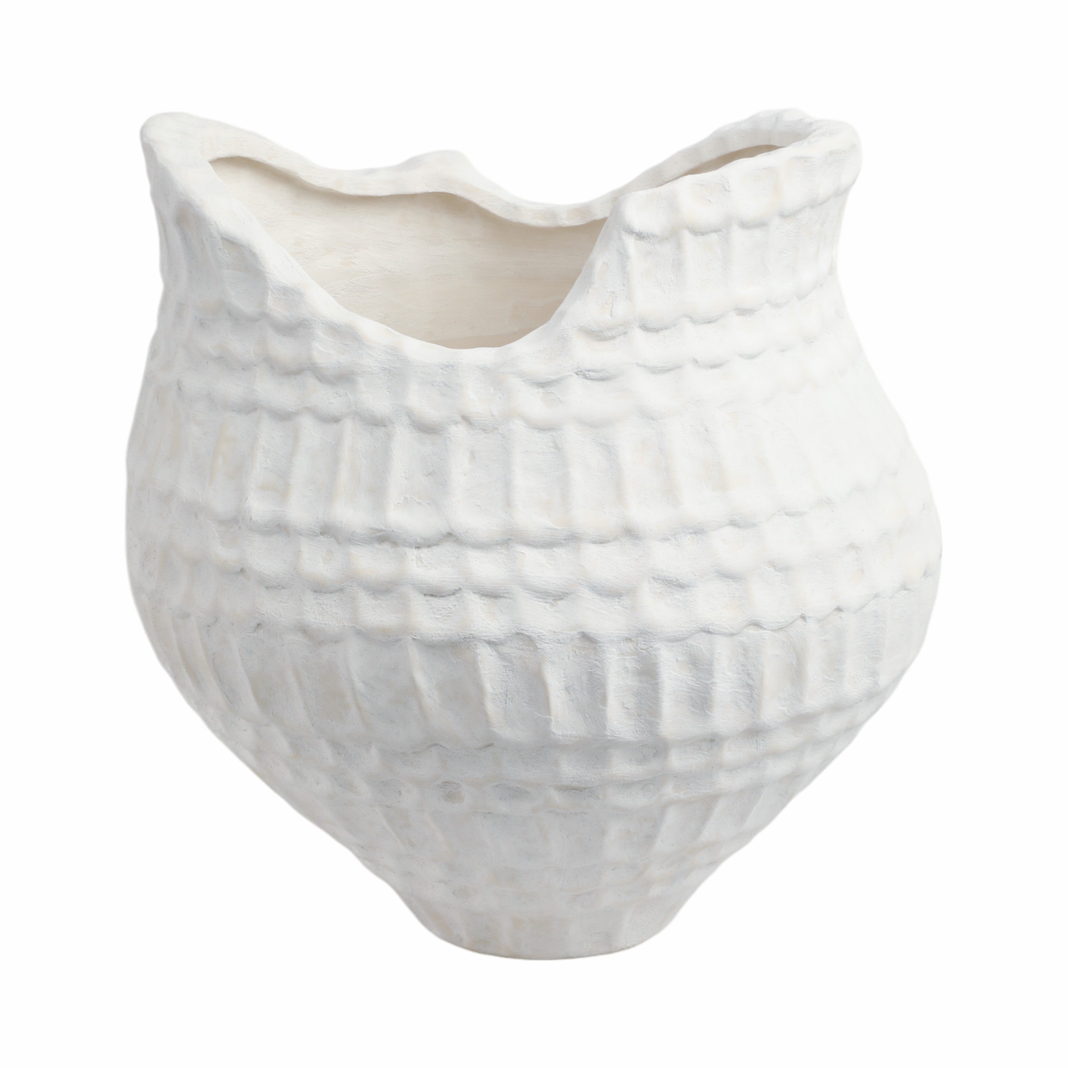 Su forma ovalada y perfil atractivo, con una apertura irregular y un patrón vertical de relieves, añade textura y carácter sin sobrecargar el espacio. De tamaño mediano, se adapta fácilmente como pieza central o complemento decorativo en tu hogar.