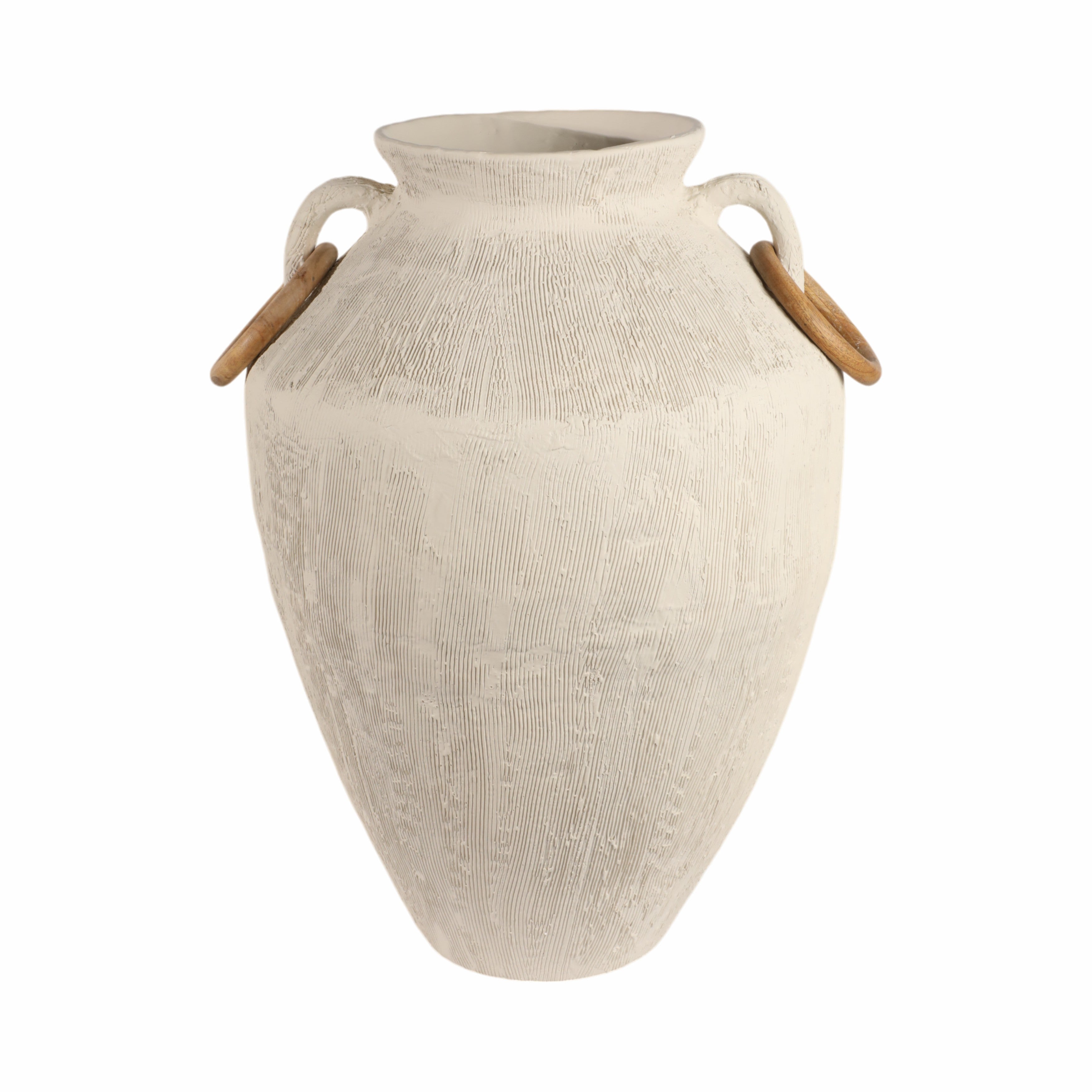 Jarrón blanco con asas de madera para decoración