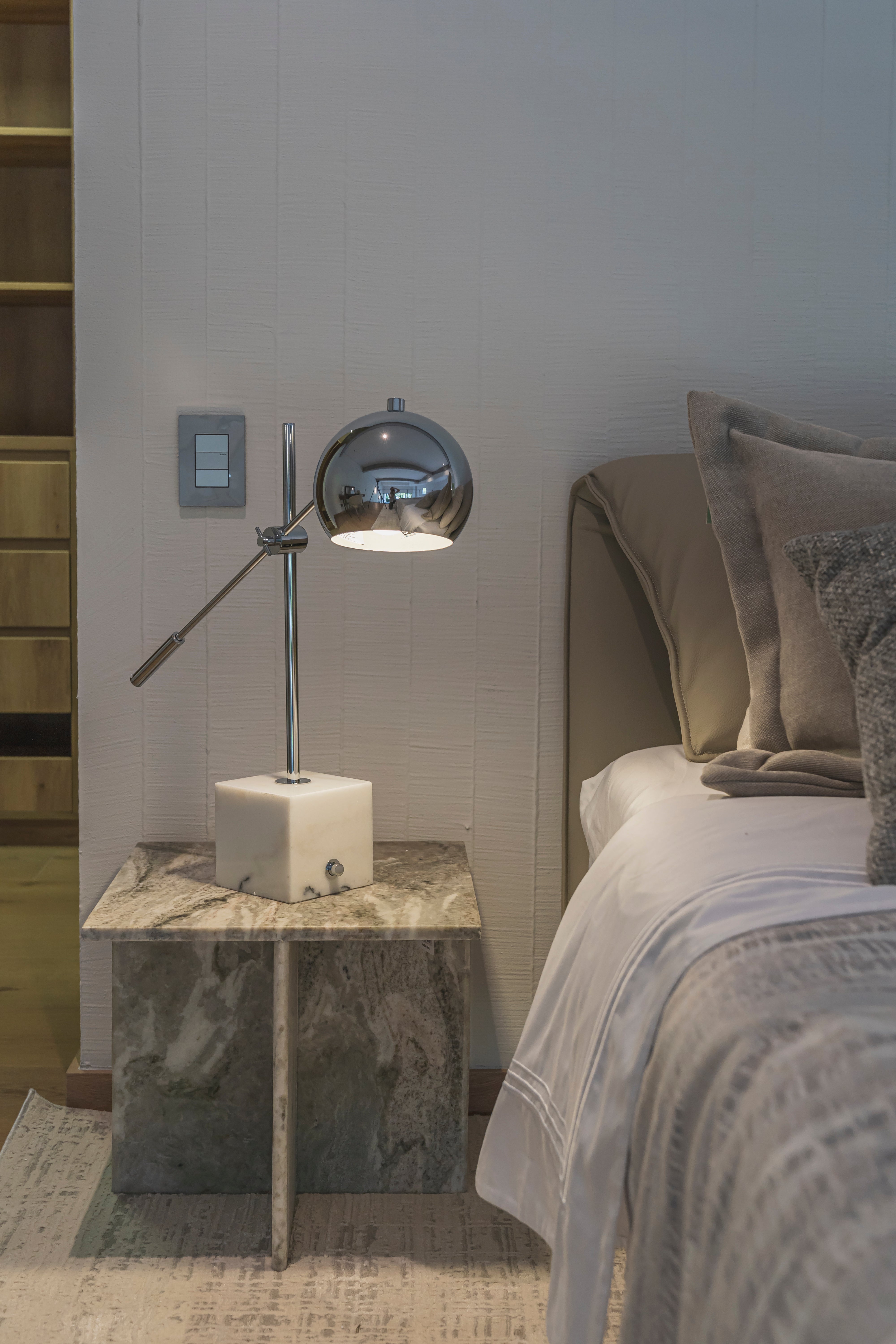 La base de mármol blanco aporta estabilidad y un toque de frescura, mientras que el metal plateado brillante añade un acabado pulido y contemporáneo que refleja suavemente la luz y el entorno.