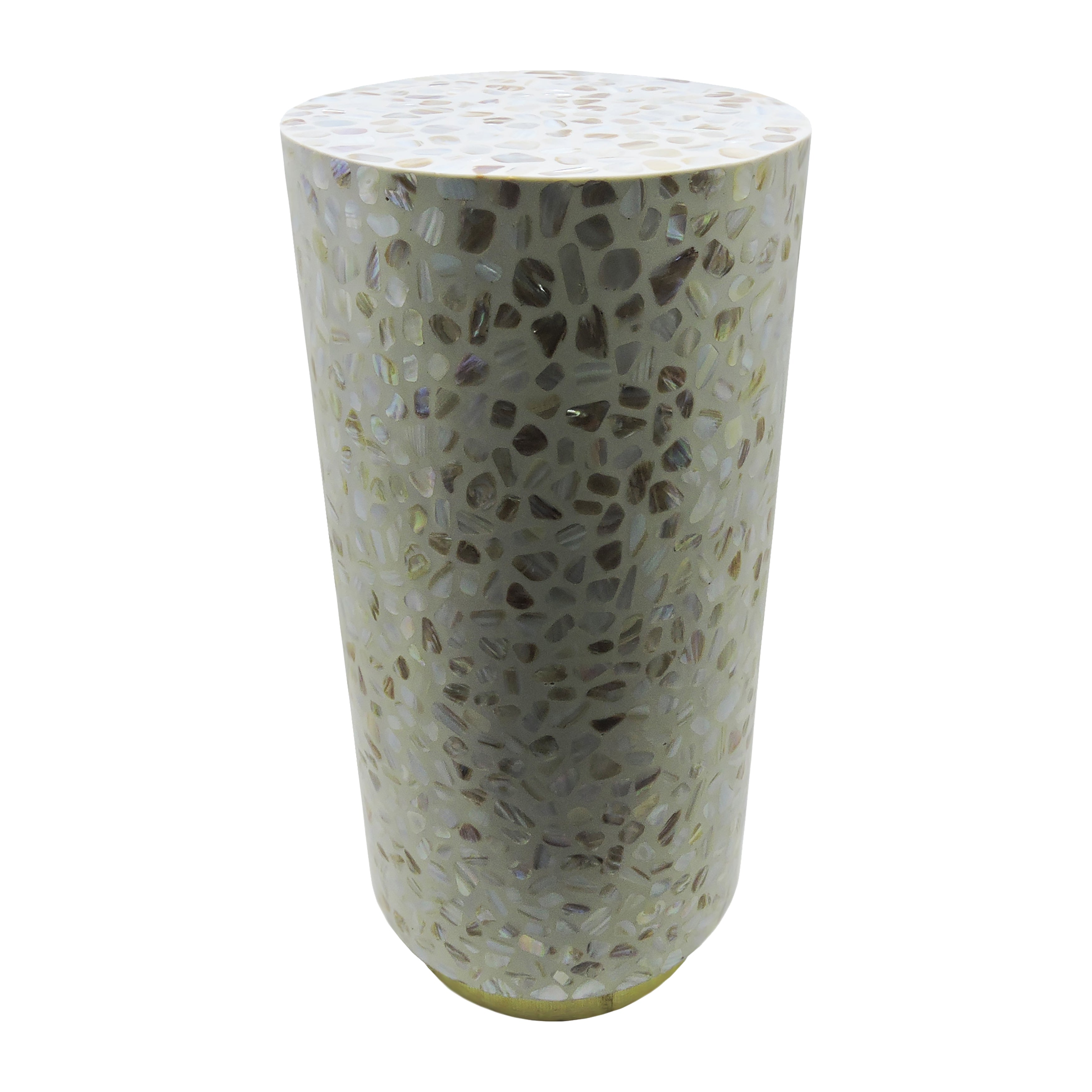 Añade un toque de elegancia y funcionalidad a tu sala con esta mesa auxiliar cilíndrica dorada. Su diseño sólido y equilibrado brinda la superficie ideal para colocar objetos pequeños, mientras el acabado en tonos gris verdoso con fragmentos iridiscentes aporta sofisticación y un brillo sutil a tu espacio.