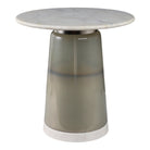 Agrega un toque de sofisticación y funcionalidad a tu sala o habitación con esta mesa auxiliar cilíndrica. Su diseño moderno combina una superficie de mármol beige y blanco con una base elegante de vidrio gris ahumado que refleja la luz y realza cualquier ambiente.