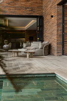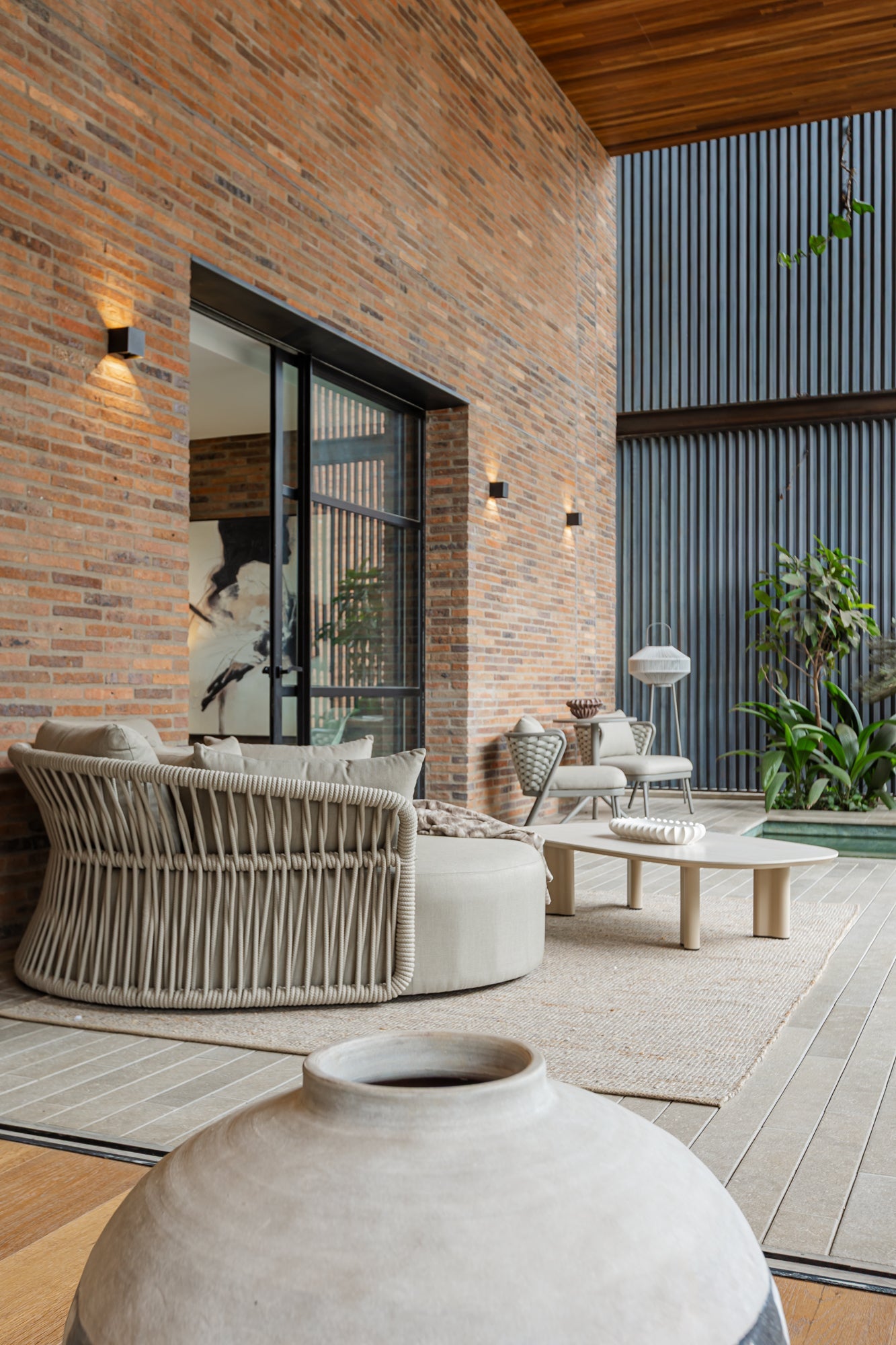 Con una estructura amplia y baja que permite la convivencia, este sofá ofrece cojines lisos y suaves que combinan a la perfección con el detalle decorativo de cuerda acrílica trenzada en sus laterales, para un toque de distinción sin perder la simplicidad.