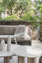 Hecha en aluminio resistente y ligera, con una superficie superior de vidrio pulido, esta mesa ofrece una textura lisa y fácil de limpiar, ideal para interiores y exteriores. Su tamaño compacto la hace perfecta para espacios reducidos o como apoyo junto a sofás y sillas.