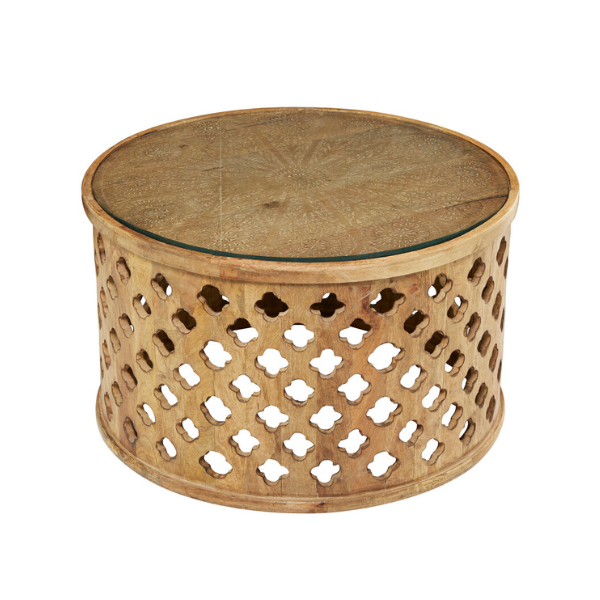 Transforma tu sala con elegancia y funcionalidad gracias a esta mesa de centro circular elaborada en madera tallada con una superficie de vidrio transparente. Este diseño ligero y aireado añade un toque de sofisticación natural a cualquier espacio, ideal para disfrutar de momentos acogedores y prácticas reuniones.