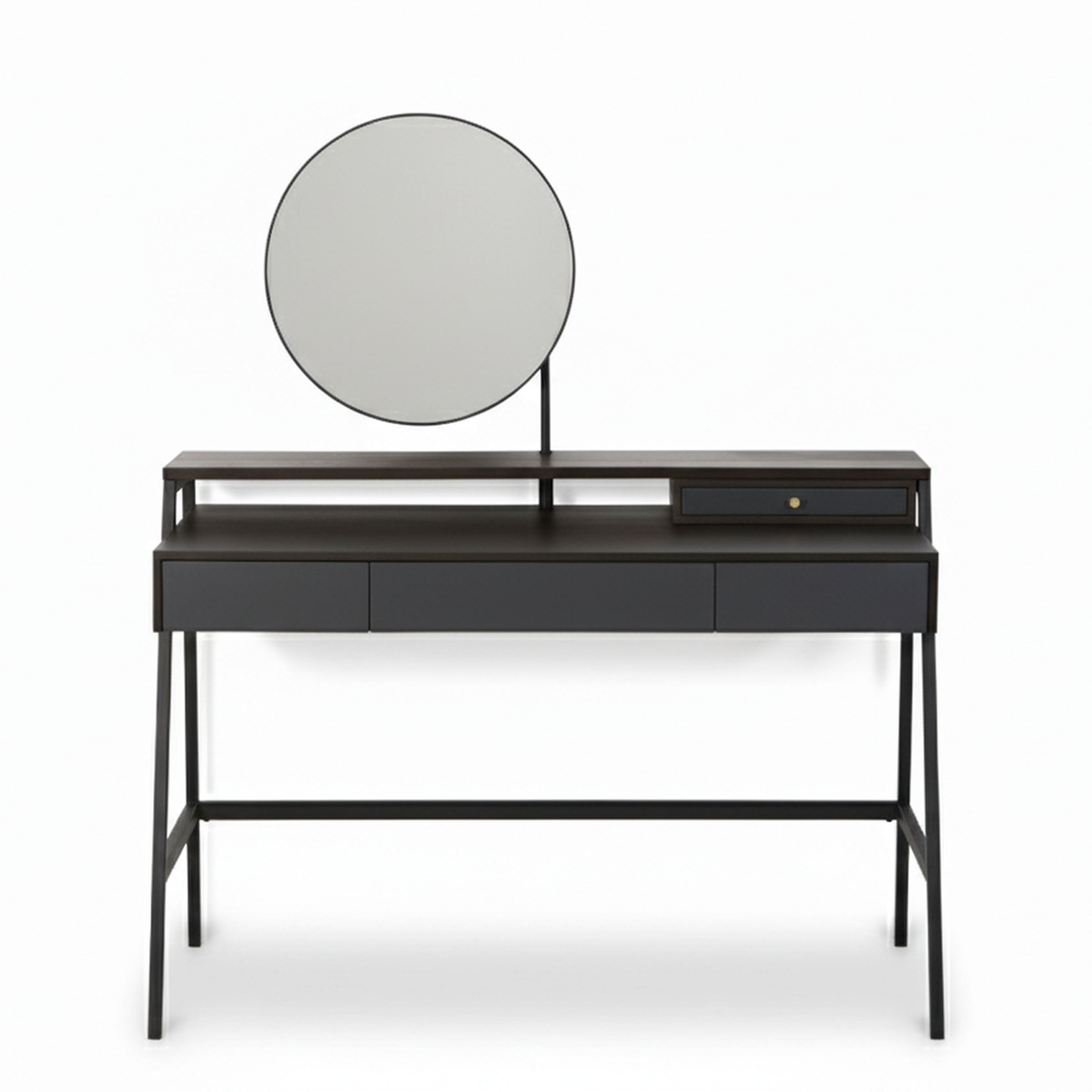 Destaca su espejo circular ajustable que facilita el uso diario y añade funcionalidad, mientras que su pequeño cajón con tirador dorado ofrece un toque de sofisticación y almacenamiento práctico. La estructura sólida con patas anguladas aporta estabilidad y un diseño contemporáneo que realza tu área personal.