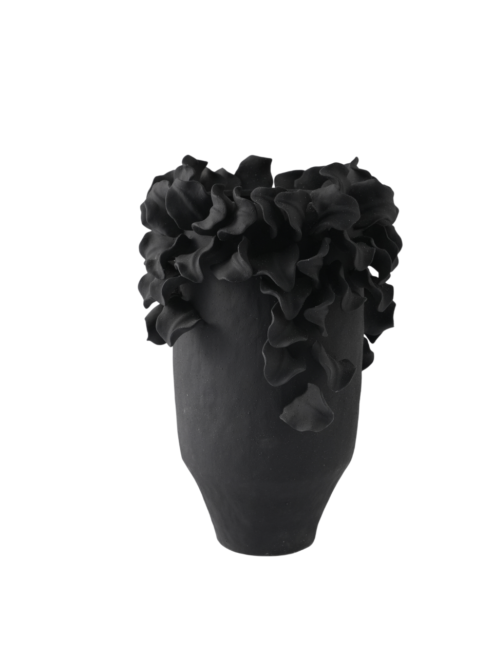 Agrega un toque de elegancia moderna a tu espacio con este jarrón decorativo negro mate, diseñado para realzar la belleza de tus flores o para destacar como una pieza artística por sí sola. Su forma cilíndrica con detalles rizados en la parte superior ofrece un encanto orgánico que transforma cualquier ambiente.