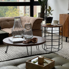 La combinación de vidrio translúcido, malla metálica negra y base de cuerda natural ofrece una textura contrastante y un acabado armonioso que complementa cualquier decoración. Es ideal para quienes buscan un elemento decorativo funcional y elegante que se adapte a múltiples espacios.