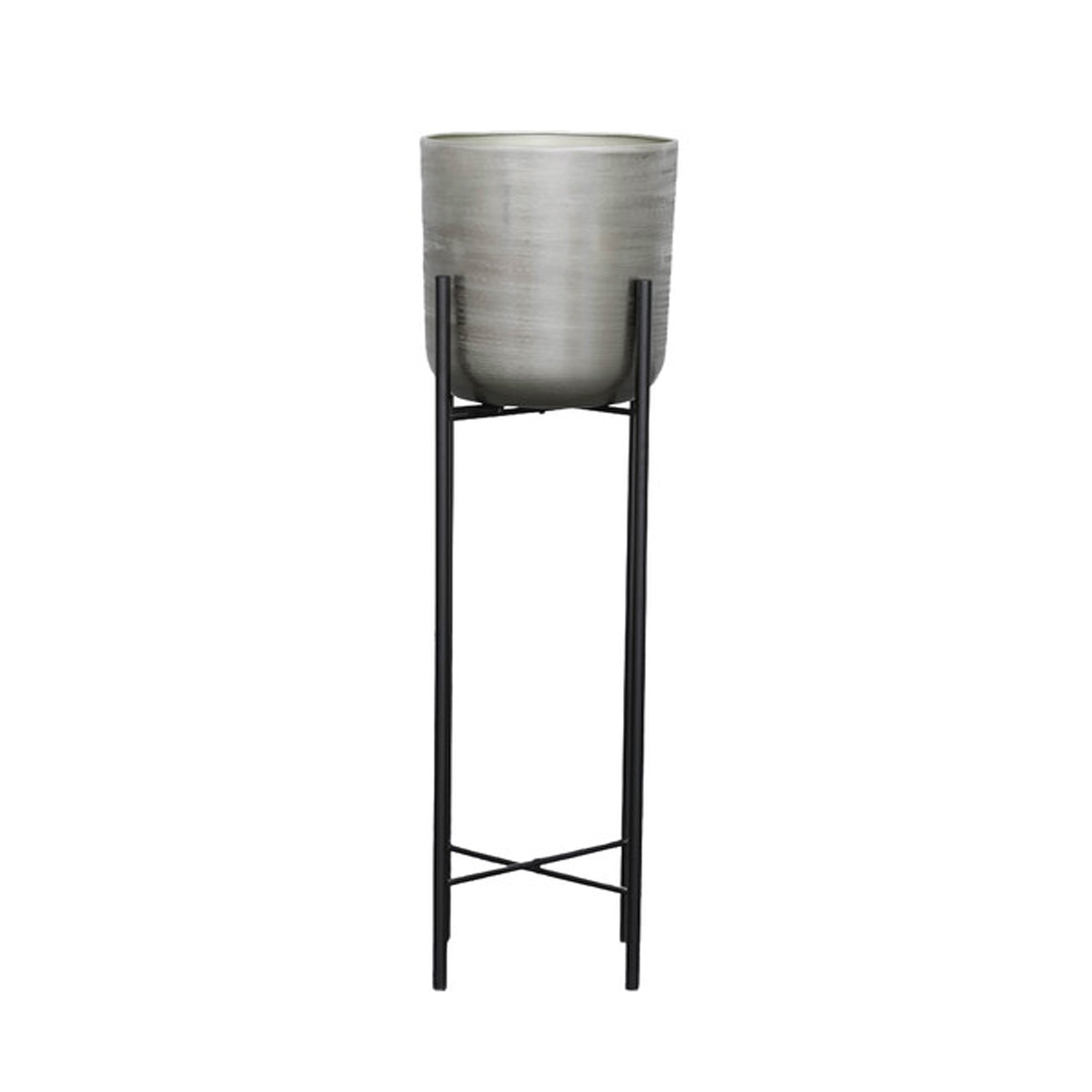 Fabricado en metal resistente, el plantador presenta un acabado plateado liso y brillante que contrasta sutilmente con su base negra mate, creando un equilibrio visual sofisticado que se adapta a varios estilos de decoración.