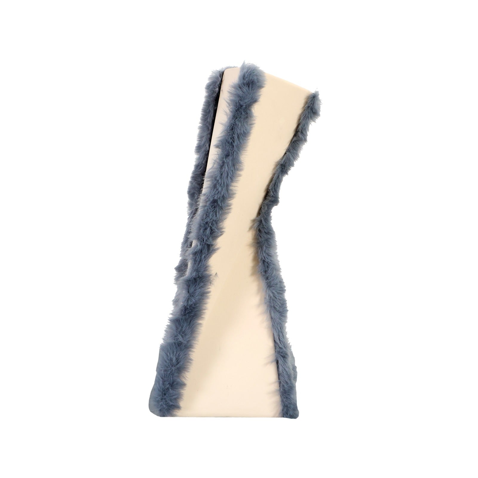Transforma tus espacios con un diseño único y moderno. Este jarrón triangular destaca por su estructura estable y su elegante combinación de tonos beige con bordes en azul grisáceo texturizados en flokada. Es perfecto para quienes buscan un toque contemporáneo y sofisticado en la decoración del hogar.