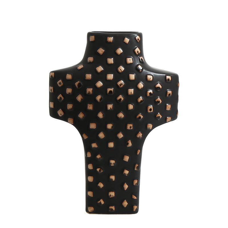 Agrega un toque artístico y moderno a tu espacio con este jarrón decorativo de cerámica en negro mate con detalles en bronce. Su forma única de cruz y el patrón tridimensional de remaches cruzados hacen que sea una pieza que capta todas las miradas, ideal para quienes desean destacar la decoración del hogar con estilo y personalidad.