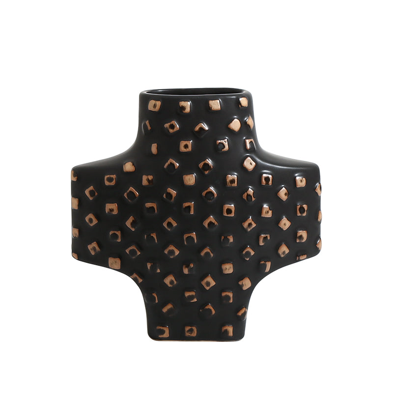Transforma cualquier espacio con este elegante jarrón decorativo negro con remaches dorados, perfecto para exhibir tus flores favoritas o como una pieza de arte independiente.